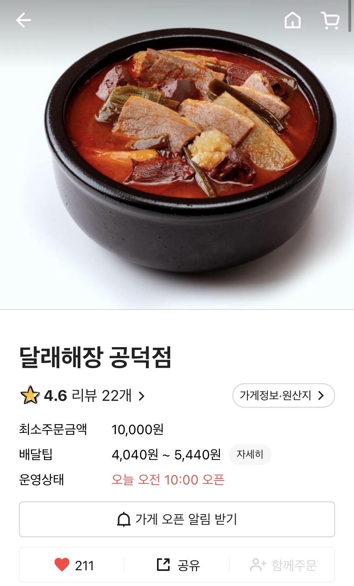 1️⃣ 특징 깔끔한 해장국을 원한다면 아주 탁월한 선택! 기호에 따라 선지는 빼고 시킬 수 있음 막걸리에 어울리는 모듬전은 종류는 다양하진 않지만 하나하나 아주 실함 김치, 석박지, 파김치를 추가해서 먹을 수 있음 2️⃣ 추천 메뉴 특해장국 어리굴젓 추가 모듬전 3️⃣ 링크 https://baemin.me/iBbqwZ-cE