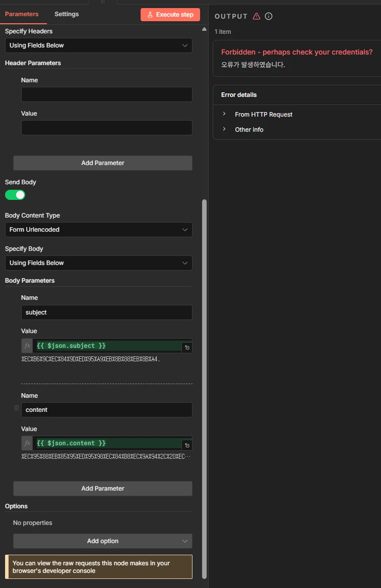 첫번째 사진을 보시면 {{ $json.subject }} ← body 파라미터에 이런 식으로 데이터를 적으면 실패합니다.