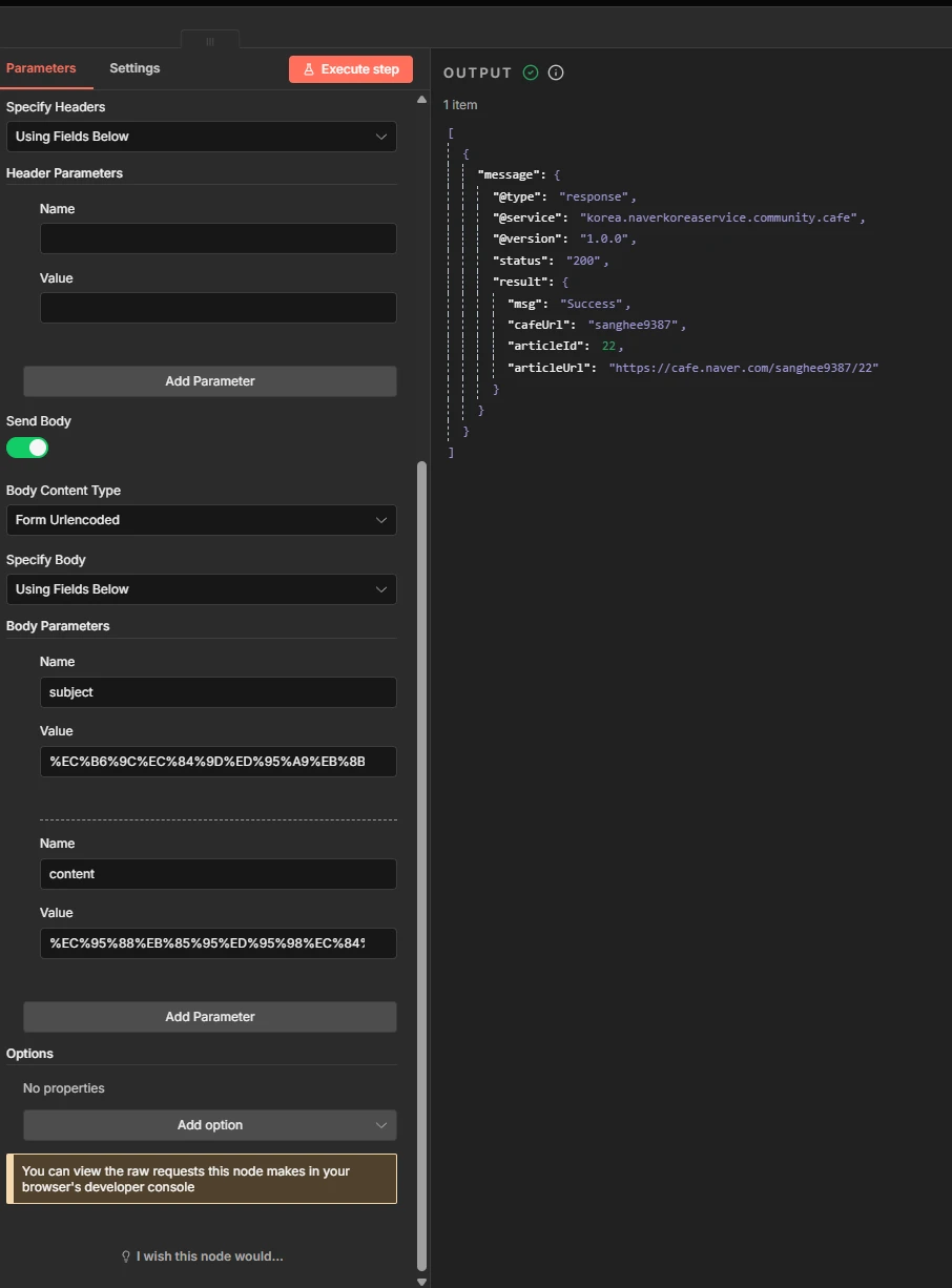 두번째 사진은 {{ $json.subject }}와 같은 값인 인코딩된 값을 그대로 body파라미터에 넣었을 땐 네이버 카페글에 한글로 정상적으로 작성됩니다.