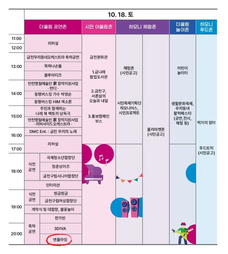 오는 10. 18.(토) 부터 10. 19.(일)까지 진행되는 금천하모니축제 세부안내입니다. 행사장별 소개입니다. ...