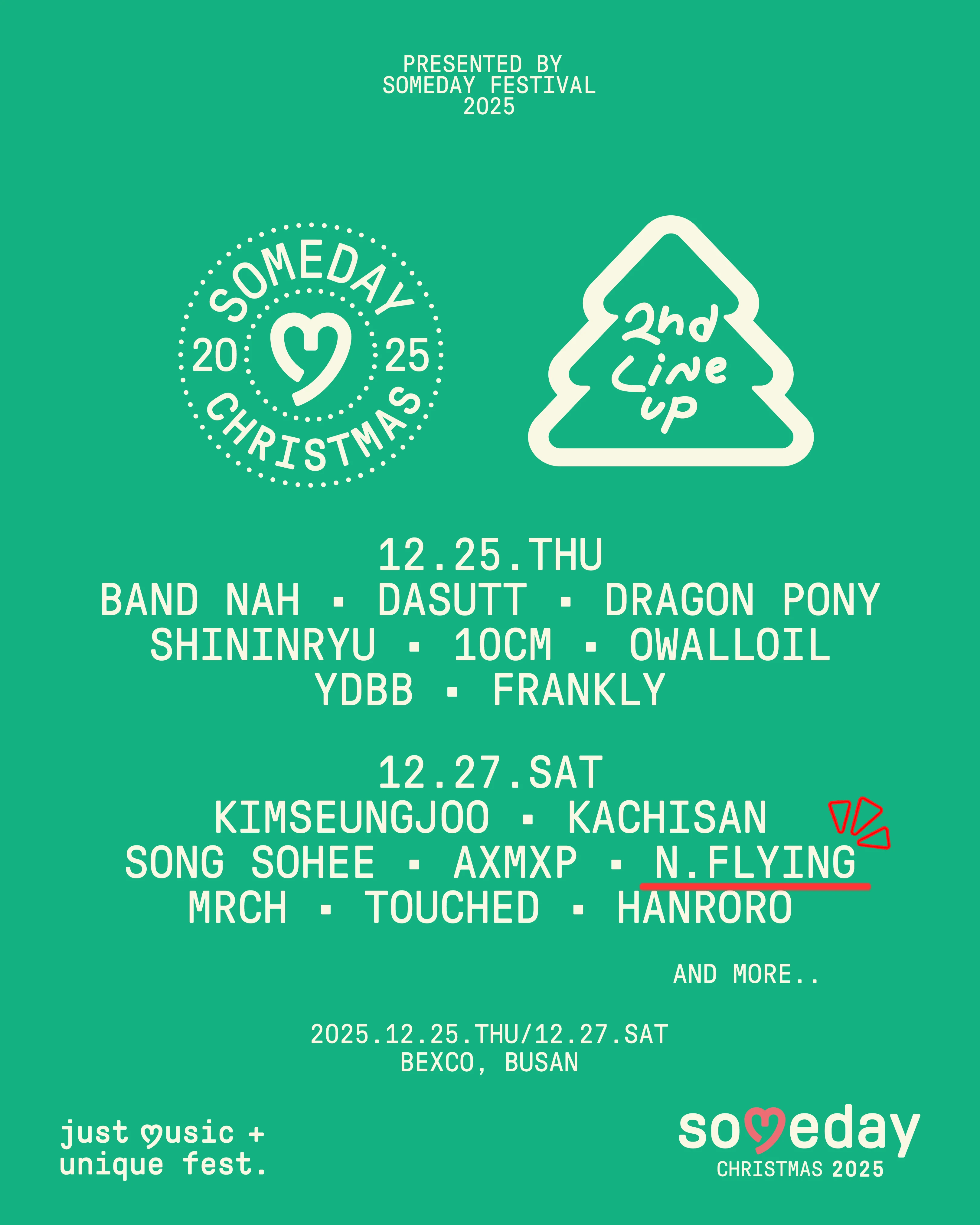 SOMEDAY FESTIVAL[Someday Christmas 2025 2차 라인업 공개]12.25나상현씨밴드다섯드래곤포니신인류10CM오월오일유다빈밴드프랭클리12.27김승주까치산송소희AxMxP엔플라잉윤마치터치드한로로▸ 일반 티켓 오픈 : 10/22(수) 18시▸ NOL티켓, 티켓링크(네이버예약), YES24, 멜론티켓, 29CM, STAYG pic.twitter.com/FwxhbYXpE2— SOMEDAY FESTIVAL (@somedayfestival) October 21, 2025