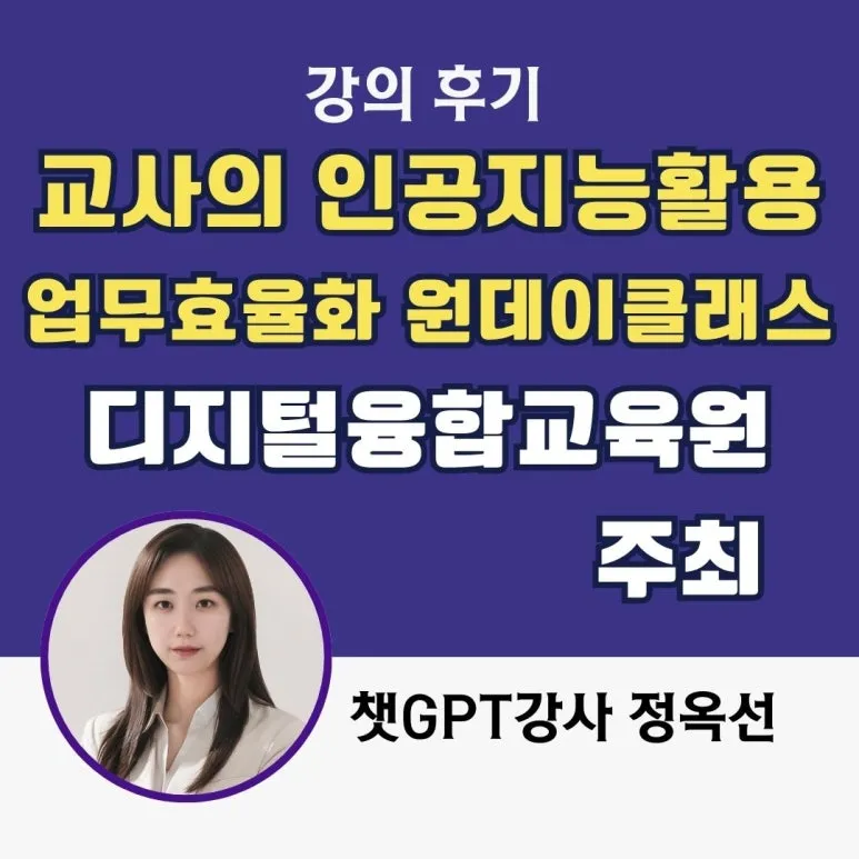 안녕하세요. 쉽게 배우는 AI 활용을 안내하는 챗GPT 강사 정옥선입니다. 이번에는 디지털융합교육원에서 진행된 '교사의 인공지능 활용 업무효율화 원데이클래스' 수업을 진행했습니다. 교사 분들의 교육 업무를 혁신적으로 향상시킬 수 있는 AI 활용법에 대한 실질적인 교육과 실습을 진행했어요. 교사분들께는 아주 반가운 시간이였죠?!