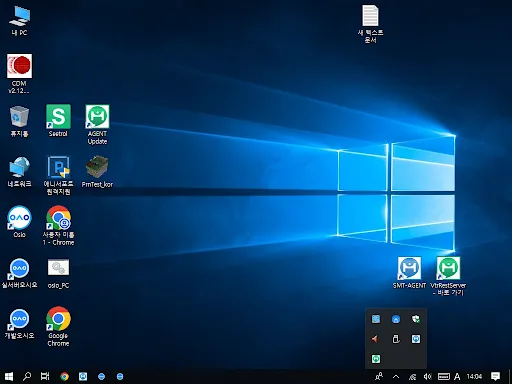 “시작 표시줄” 부분에서 오른쪽 “숨겨진 아이콘 표시(위쪽 방향 화살표)” 를 선택한 뒤 두 가지 프로그램 아이콘이 있는지 확인해주세요. (실행 중인 프로그램 목록에 없다면 바탕화면에서 VtrRestServer(초록색 아이콘), SMT-AGENT(파란색 아이콘) 프로그램을 실행해주세요.)