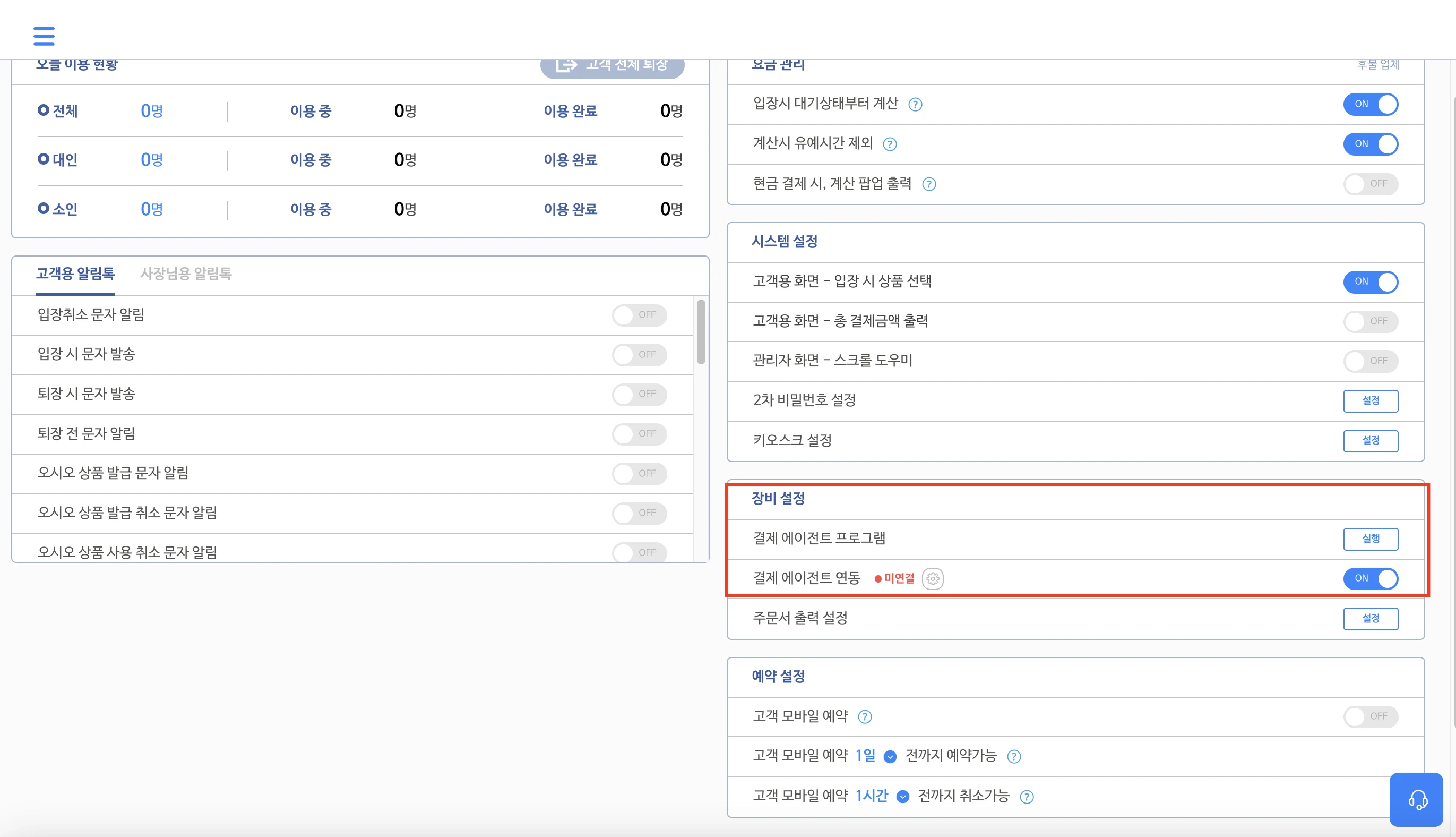 “결제 에이전트 연동” 항목 우측 토글(On/Off) 비활성화 후 다시 활성화 해주세요. (Off 상태였다면, On 으로 변경해주세요.)