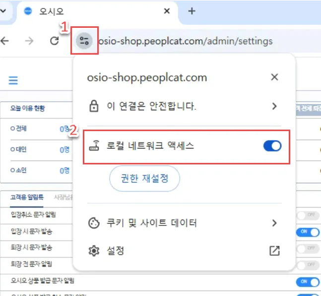 크롬 사용하는 매장의 경우, 상단에 있는 검색바 좌측 아이콘(1)을 클릭해 주세요.