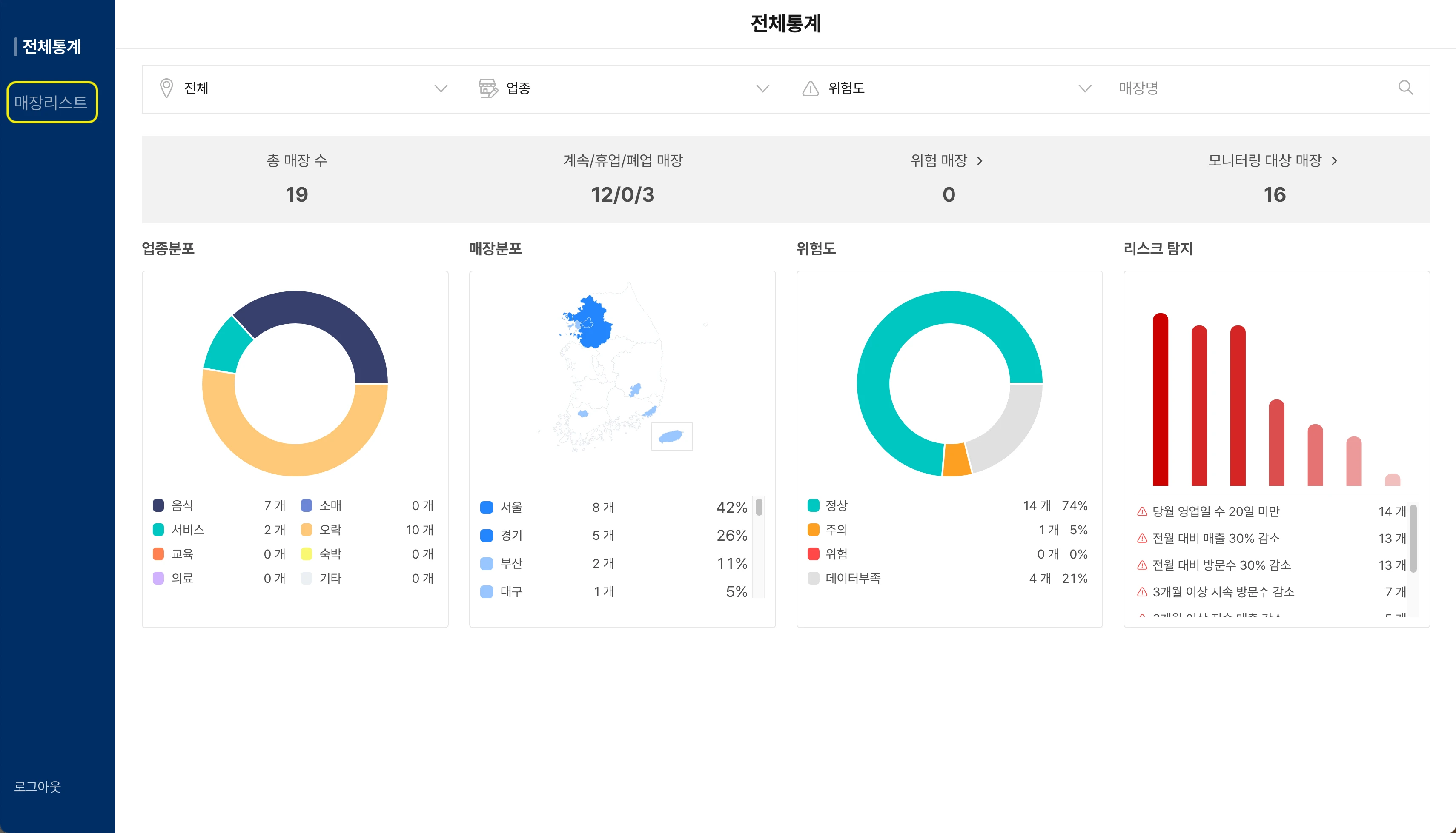 좌측의 매장리스트 페이지로 이동해 주세요.