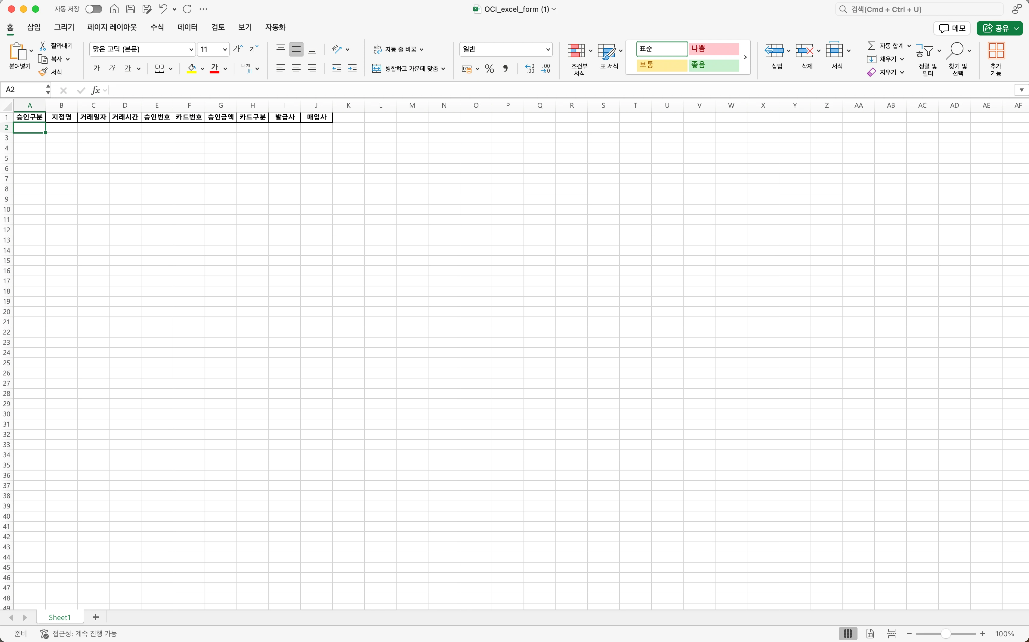 제공된 엑셀 양식의 모든 컬럼(열)의 데이터가 존재해야합니다.