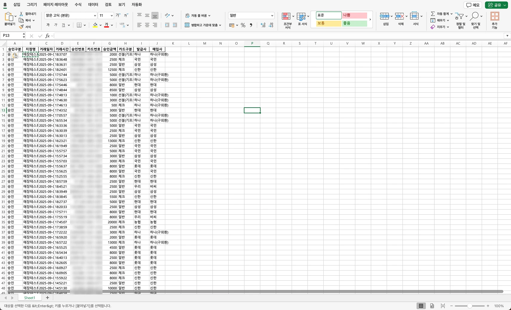 '승인구분' 에는 '승인' 데이터만 들어올 수 있습니다.(결제승인 데이터로만 처리하기로 했습니다. 걸제 취소 등과 같은 데이터는 불필요!)