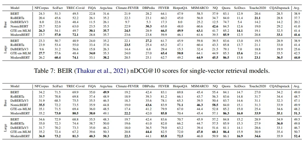 최근 올라오는 임베딩 모델 중 ModernBERT 구조 기반으로 학습된 모델들이 많다. 이에따라, ModernBERT 모델의 논문을 리뷰를 해보자 (11/10) Code Review는 아직 진행 중 TL;DR 기존 BERT보다 512 → 8192 input token으로 증가 RoPE (Rotary Positional Encoding) GeGLU, Normalization, Bias Term Disabling, Deep-Narrow, Alternating Attention, Flash Attention 2 / 3, Unpadding 등 최신 기법들을 사용해서 아키텍쳐를 구성함 Alternating Attention으로 로컬-글로벌 어텐션 2조 개의 토큰으로 훈련함 (근데 영어 데이터로만 했음) 1. 논문이 다루는 Task GLUE, IR, Code IR IR도 Single-Vector, Multi-Vector를 테스트하고, MLDR (long document)를 평가함 2. 기존 연구 한계 가장 중요한건, 컨텍스트 길이 제한 (512), 비효율적인 아키텍처 학습 효율만 개선 / 검색 성능에 초점.. 이런식으로 한 부분에만 초점을 뒀음 추가로, 데이터가 너무 구식이라 코드 과제에서 한계가 있다함 3. 제안 방법론: Main Idea Architectural Improvements Modern Transformer RoPE 위치 정보 처리랑 더 많은 컨텍스트를 처리하기 위함