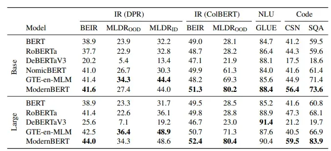 최근 올라오는 임베딩 모델 중 ModernBERT 구조 기반으로 학습된 모델들이 많다. 이에따라, ModernBERT 모델의 논문을 리뷰를 해보자 (11/10) Code Review는 아직 진행 중 TL;DR 기존 BERT보다 512 → 8192 input token으로 증가 RoPE (Rotary Positional Encoding) GeGLU, Normalization, Bias Term Disabling, Deep-Narrow, Alternating Attention, Flash Attention 2 / 3, Unpadding 등 최신 기법들을 사용해서 아키텍쳐를 구성함 Alternating Attention으로 로컬-글로벌 어텐션 2조 개의 토큰으로 훈련함 (근데 영어 데이터로만 했음) 1. 논문이 다루는 Task GLUE, IR, Code IR IR도 Single-Vector, Multi-Vector를 테스트하고, MLDR (long document)를 평가함 2. 기존 연구 한계 가장 중요한건, 컨텍스트 길이 제한 (512), 비효율적인 아키텍처 학습 효율만 개선 / 검색 성능에 초점.. 이런식으로 한 부분에만 초점을 뒀음 추가로, 데이터가 너무 구식이라 코드 과제에서 한계가 있다함 3. 제안 방법론: Main Idea Architectural Improvements Modern Transformer RoPE 위치 정보 처리랑 더 많은 컨텍스트를 처리하기 위함