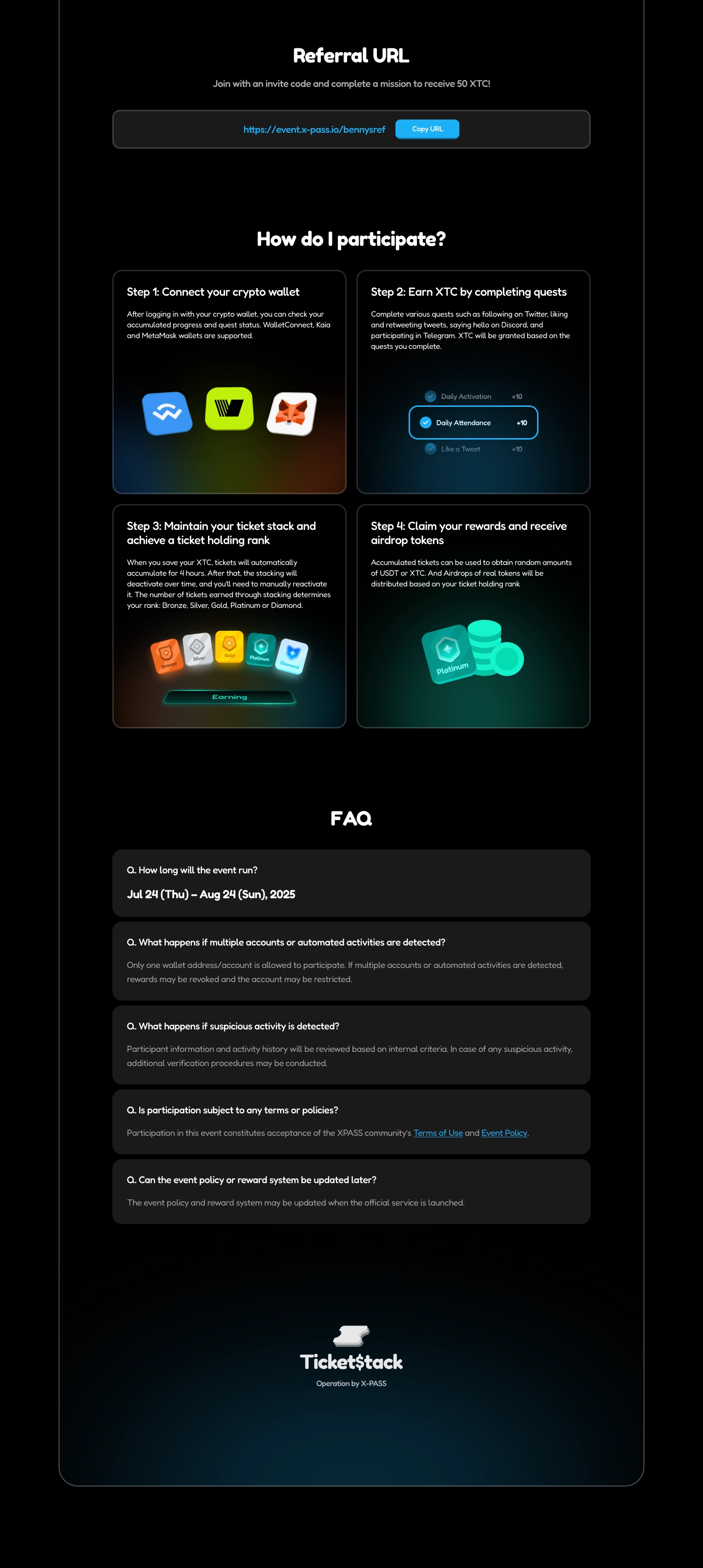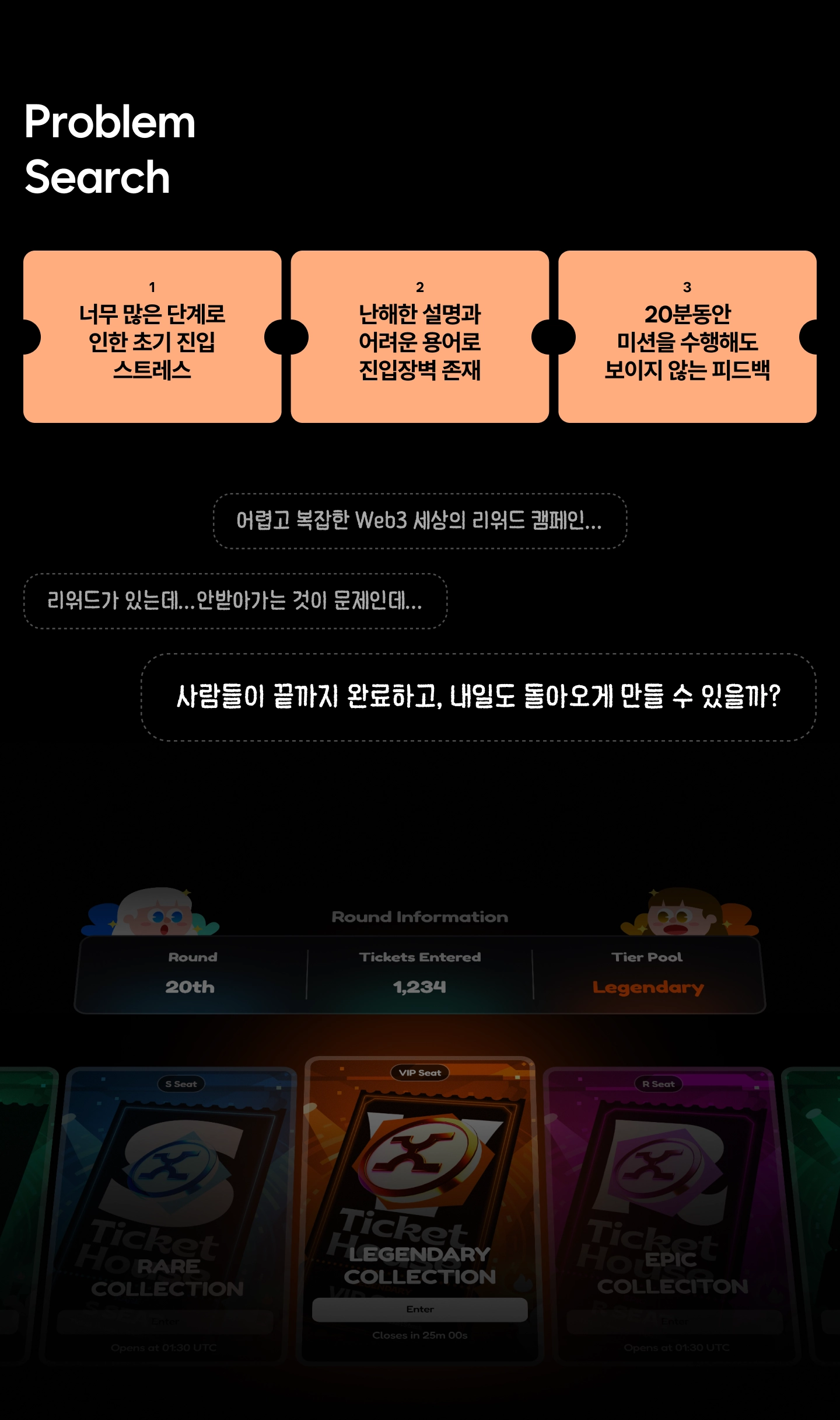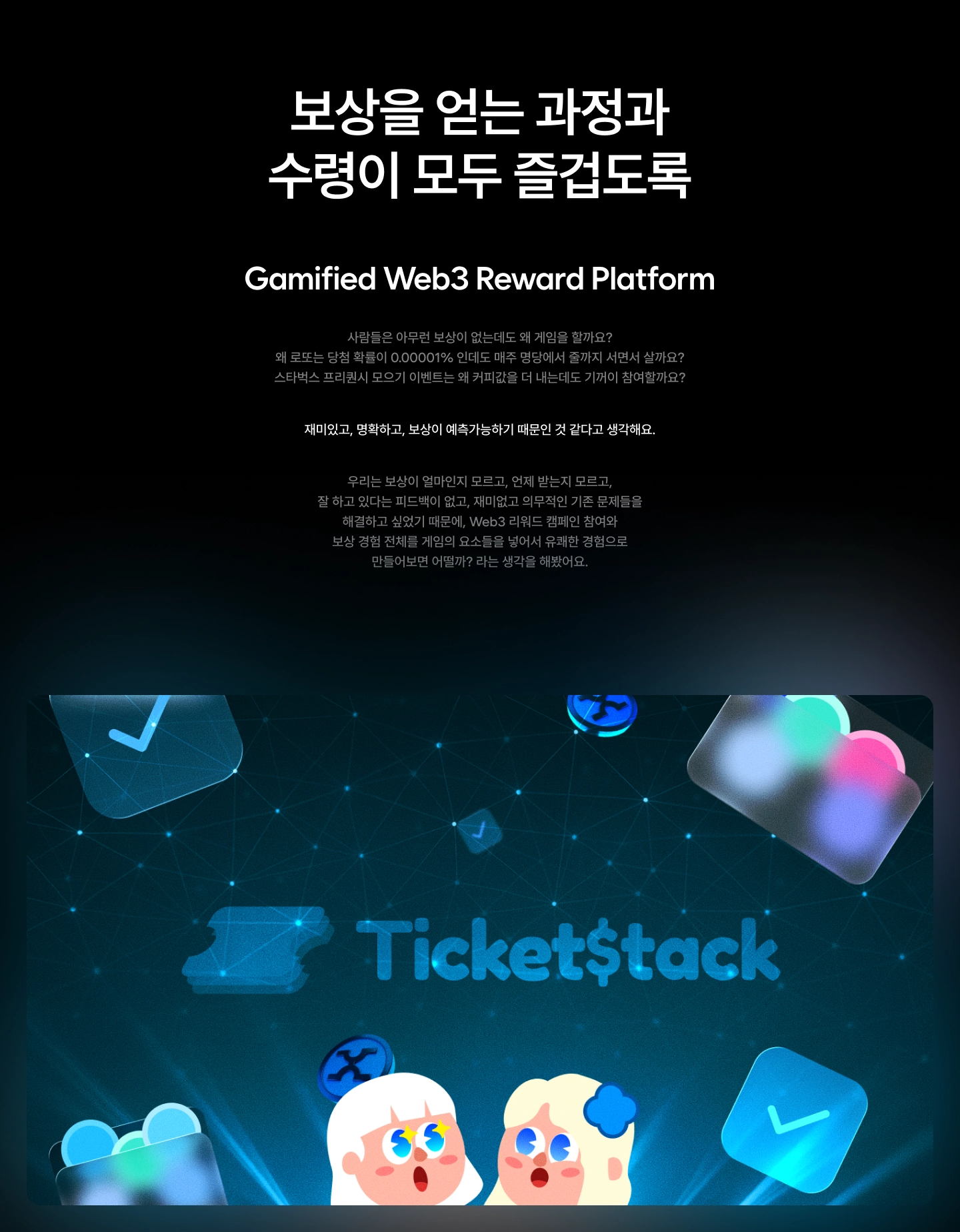 한 달 만에 100만 지갑 돌파한 Web3 리워드 플랫폼, 무엇이 달랐을까? -TicketStack EP.13줄로 요약해보기Web3 리워드 캠페인의 대부분의 사용자는 리워드 미션 수행 도중 포기해요.다수의 리워드 캠페인을 분석해서 3가지 큰 문제들을 찾았어요.이 문제들을 해결했더니 한 달 만에 100만 지갑이 참여했어요.복잡한 Web3 리워드, 끝까지 못하겠어!"트위터 팔로우, 디스코드 입장, 텔레그램 입장, 지갑 연결, 리트윗, 폼 작성..." Web3 세계의 에어드랍을 참여해보신 적이 있나요?무료로 토큰을 준다는데, 어느새 20분이 지나도록 "다음단계" 버튼을 누르고 있는 자신을 발견하게 돼요.그러다 지갑 연결이 안되거나, 어떤 정보를 입력해야 할 지 몰라서 포기하기 일쑤고요...X-Pass의 고민 : "티켓을 산 사람들이 다시 오게하고싶어!"X-Pass는 NFT 기반의 공연 티켓팅 플랫폼이에요. 뮤지컬을..