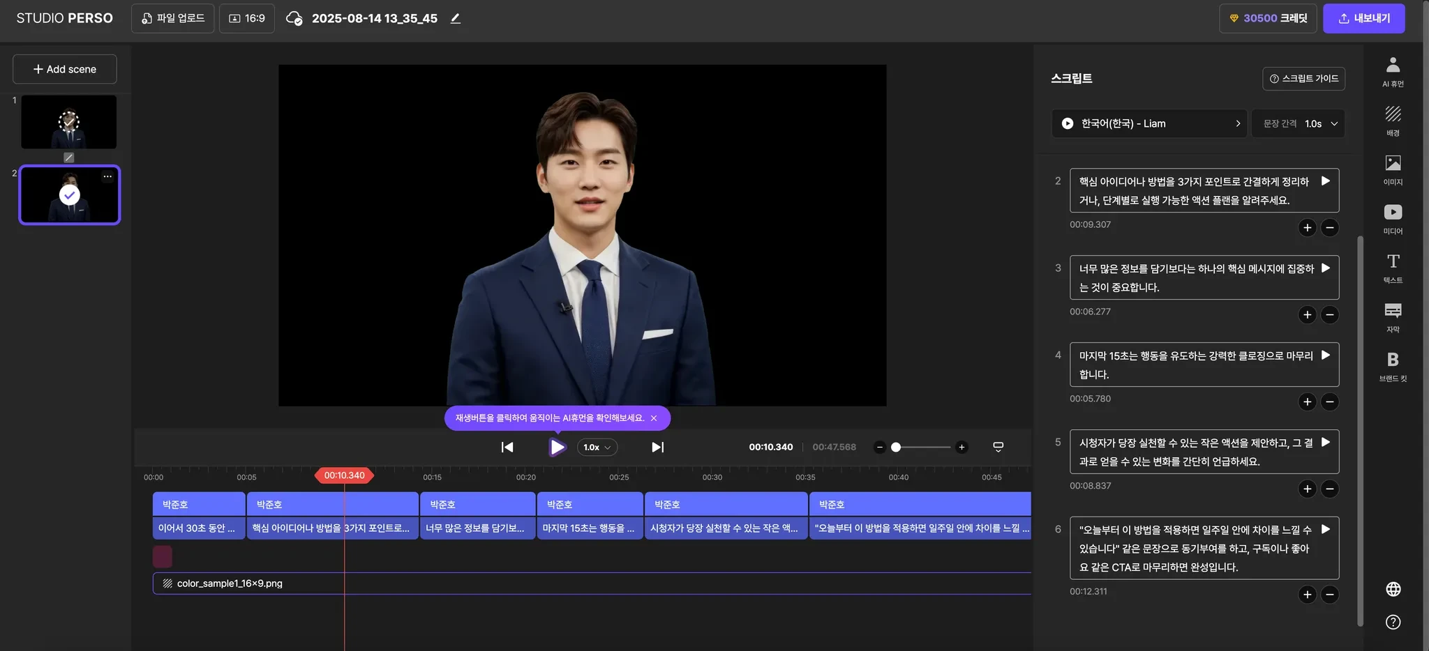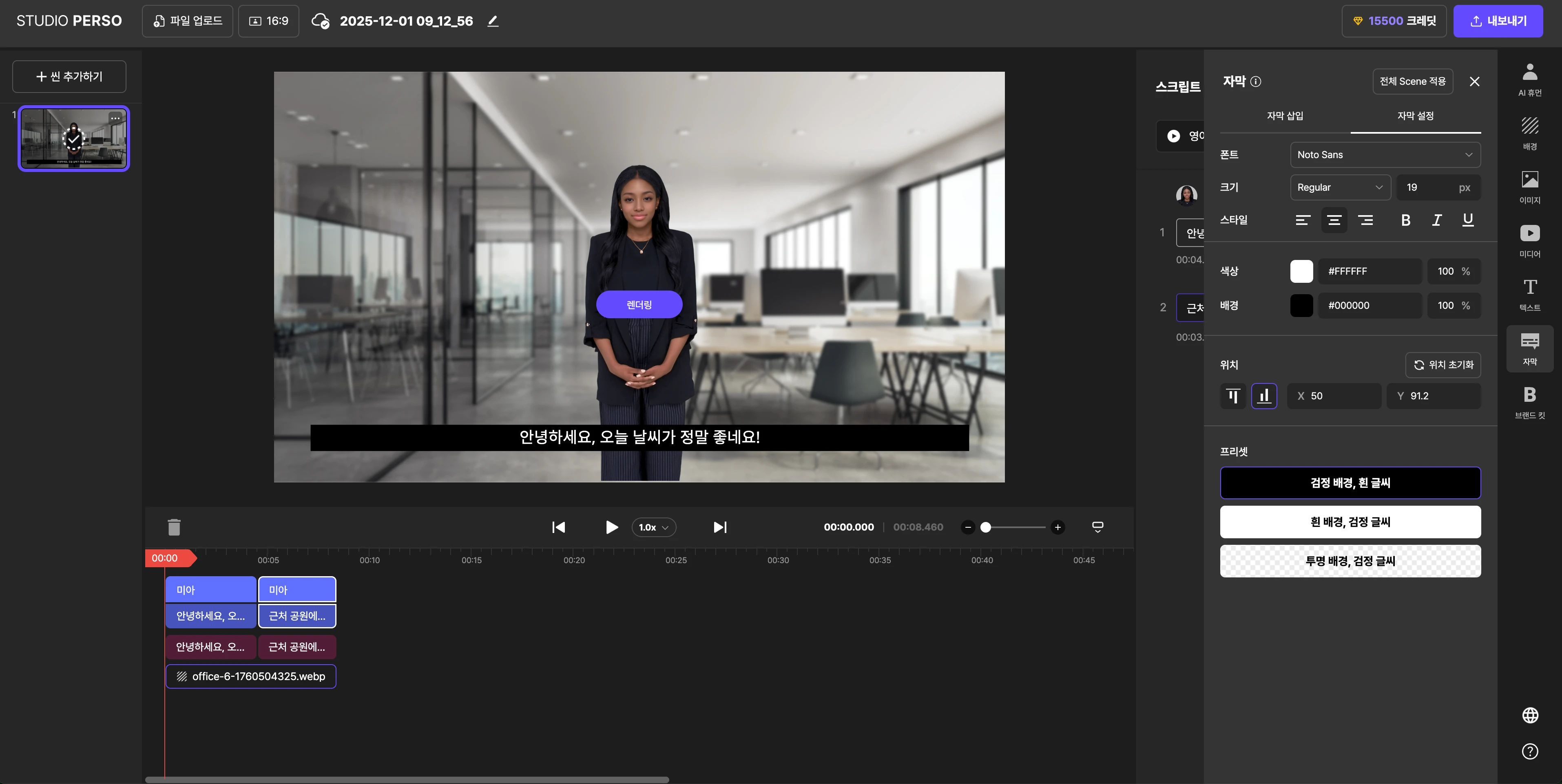 안녕하세요, Perso AI 팀입니다! 😊 영상 제작 시 자막이 하단의 중요한 정보를 가려서 불편하셨나요? 이제 자막을 원하는 위치에 자유롭게 배치할 수 있습니다! ✨ 무엇이 달라졌나요? 1️⃣ 자막 위치를 자유롭게 이동할 수 있어요 기존에는 자막이 화면 하단에만 고정되어 있었는데요, 이제는 상단, 하단, 또는 원하는 어떤 위치든 자유롭게 배치할 수 있습니다! 차트나 표 같은 중요한 시각 자료가 하단에 있을 때, 자막을 상단으로 올려서 내용이 가려지지 않도록 조정할 수 있어요. 2️⃣ '위치' 설정 메뉴가 새로 생겼어요 우측 자막 메뉴에 '위치' 항목이 추가되었습니다. 📌 간편 배치 버튼 하단 고정 아이콘: 기존처럼 하단 영역에 자동으로 배치돼요 상단 고정 아이콘: 상단 영역에 여유를 두고 자동으로 배치돼요 🎯 정밀 배치 (X, Y 좌표 입력) X축, Y축 입력 필드에 원하는 좌표 값을 직접 입력하면 정확한 위치에 자막을 배치할 수 있어요 다른 씬에서도 동일한 좌표 값을 입력하면 자막이 같은 위치에 나타나서, 씬이 바뀌어도 자막이 튕기지 않고 자연스럽게 재생됩니다! 3️⃣ '위치 초기화' 버튼으로 언제든 되돌릴 수 있어요 자막 위치를 여기저기 조정하다가 처음으로 돌아가고 싶으신가요? '위치 초기화' 버튼을 누르시면 기본 하단 고정 위치로 바로 돌아갑니다. 💡 이렇게 활용해보세요!