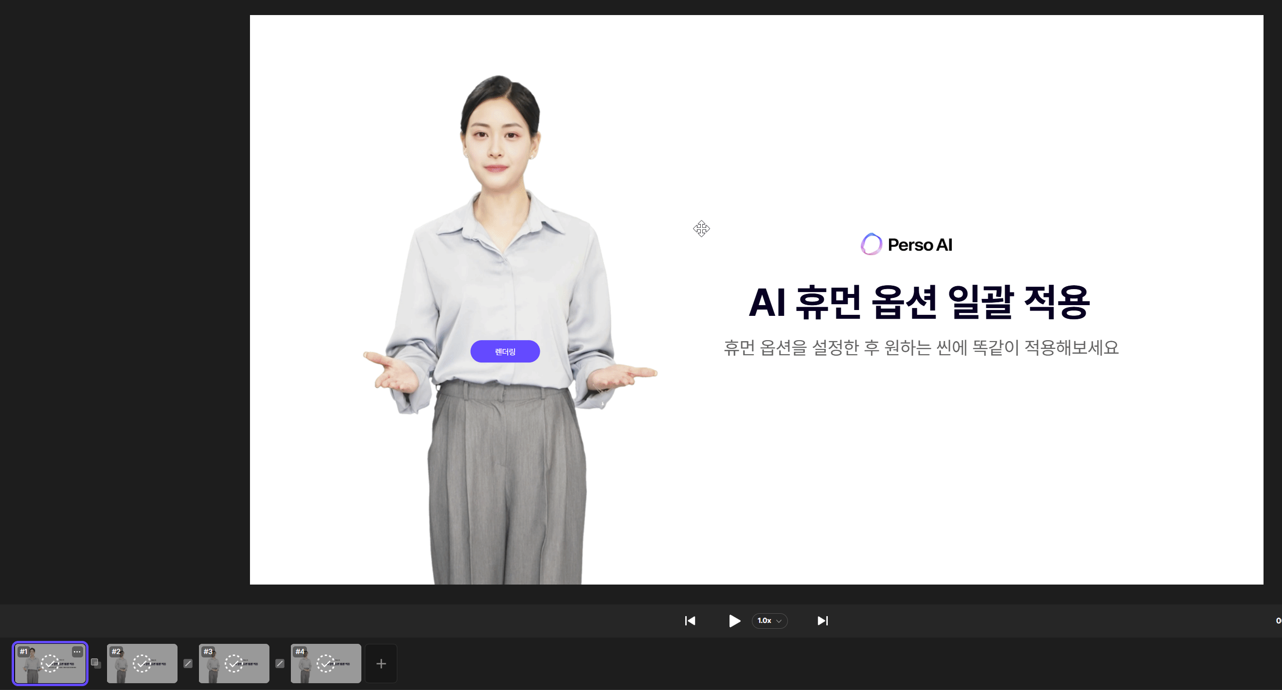 STUDIO PERSO는 AI 휴먼을 활용한 영상 제작 서비스입니다. 기존 영상 제작처럼 촬영, 편집, 음성 녹음 등의 복잡한 과정 없이도 빠르고 간편하게 고퀄리티 영상을 만들 수 있습니다. STUDIO PERSO의 핵심 기능은 뭔가요? 스크립트 입력 → 텍스트 입력만으로 AI 휴먼이 자연스럽게 말하는 영상을 제작합니다. PPT 업로드 → 기존 발표 자료를 영상 콘텐츠로 변환합니다. 다양한 시각적 효과 추가 → 텍스트 효과, 배경 변경, 자막 삽입 등 다양한 효과를 추가할 수 있습니다. STUDIO PERSO를 어떻게 활용하나요? 기업 프레젠테이션 → PPT를 업로드하여 전문적인 프레젠테이션 영상 제작할 수 있습니다. 온라인 강의 & 교육 콘텐츠 → AI 휴먼을 통해 신뢰도 높은 교육 영상을 빠르게 제작할 수 있습니다. 인터뷰 & 뉴스 → '정장' 착장 + '진지함' 포즈를 통해 신뢰도 높은 영상 제작할 수 있습니다. 마케팅 & 광고 → '캐주얼' 착장 + '자연스러움' 포즈를 통해 제품 정보를 보다 자연스럽고 매력적으로 전달할 수 있습니다. 관련 문서 STUDIO PERSO에서 제공하는 AI 휴먼이란 무엇인가요? PPT 파일 업로드는 어떻게 하나요? 텍스트 업로드는 어떻게 하나요? 입력한 스크립트의 자막은 어떻게 추가하나요? 배경 화면을 적용할 수 있나요?