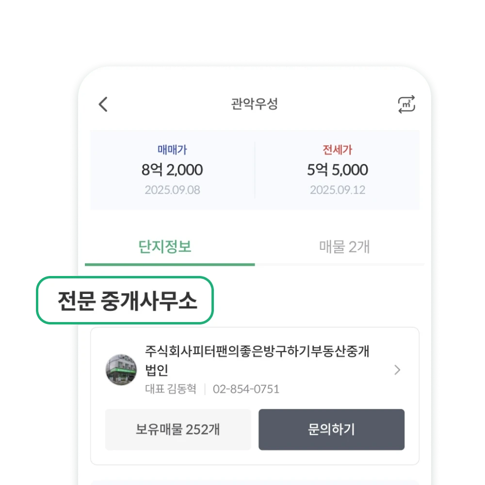 원하는 아파트의 단지 정보 최상단에 중개사 프로필이 노출됩니다. 아파트 단지의 대표 공인중개사가 될 수 있는 기회를 획득해보세요!
