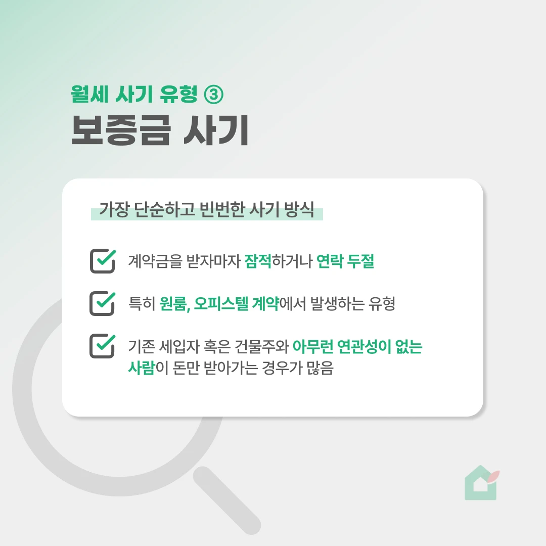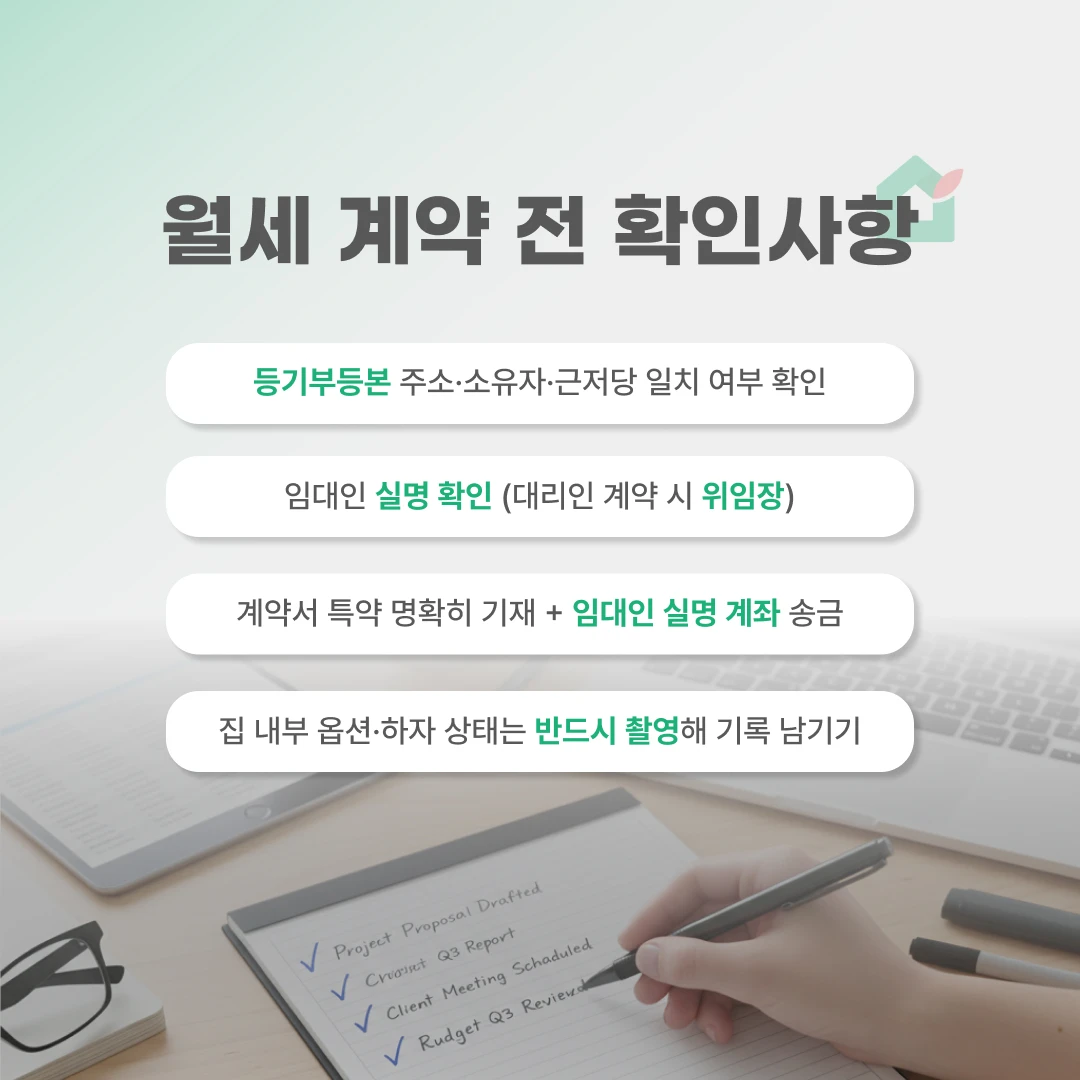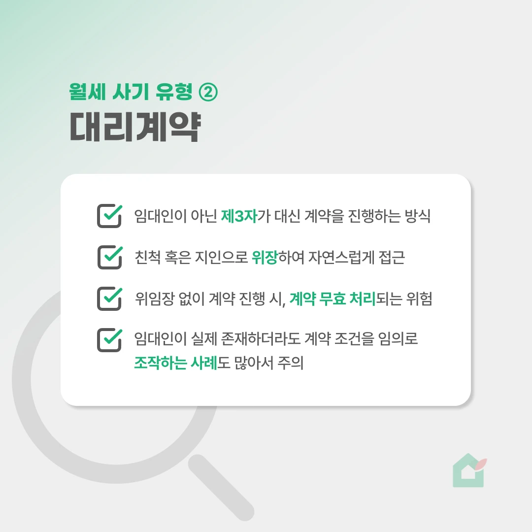 요즘 월세 시장에서 이중계약·대리계약 같은 신종 사기가 증가하고 있어요. 월세 수요가 늘면서, 전세사기에서 쓰이던 수법이 월세 계약으로 옮겨오고 있는데요. 오늘은 계약할 때 반드시 봐야 할 월세 사기 유형과 예방 체크포인트를 정리했어요. 📢 빠르게 읽는 세 줄 요약 월세 시장에서도 이중계약·대리계약 같은 사기 유형이 빠르게 늘고 있어요. 계약 전 등기·임대인·송금 계좌만 확인해도 대부분의 위험을 막을 수 있어요. 작은 보증금이어도 사기 예방 체크포인트를 정확히 챙겨보세요. 🏠 월세 사기, 왜 지금 다시 문제될까? 전세 값이 상승하고 거래가 주춤해지자 월세 수요가 늘었고, 동시에 계약 구조가 단순한 월세를 노린 사기 방식도 늘어났어요. 특히 보증금이 적어서 안전하다는 인식 때문에 세입자가 방심하기 쉬워요. 최근에는 전세사기에서 쓰이던 수법이 월세로 그대로 이동하는 추세라 더 주의가 필요합니다. ✅ 월세 사기 유형 ① - 이중계약(중복계약) 이중계약은 같은 방을 여러 사람에게 동시에 계약시키는 방식으로, 월세 시장에서 가장 자주 발생하는 사기 유형이에요. 공실 여부를 제대로 확인하지 않거나, 임대인·소유자 정보를 확인하지 않은 상태에서 서둘러 계약할 때 많이 발생합니다. 중개사나 임대인이 계약을 급하게 압박하거나, 현장에서 기존 세입자의 짐이 그대로 있는 경우도 흔한 신호예요. ✔️ 실제 피해에서 자주 등장하는 패턴 계약금만 받고 잠적 → 연락 두절
