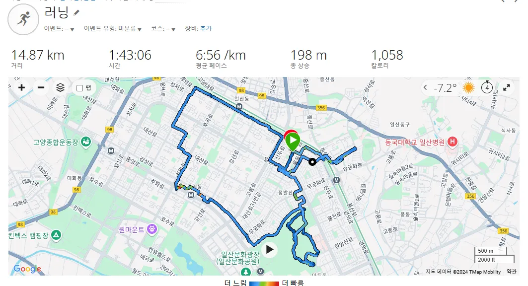 ⏰ AM 6:35 👟 알파플라이1 장거리 하려면 일찍 일어나야 하는데 늦었다. 정발산도 오르고 일부러 골목을 회전하며 조깅으로 마무리. 20도 채우지 못해 아쉽다. 근력운동도 틈틈이 해주었다.