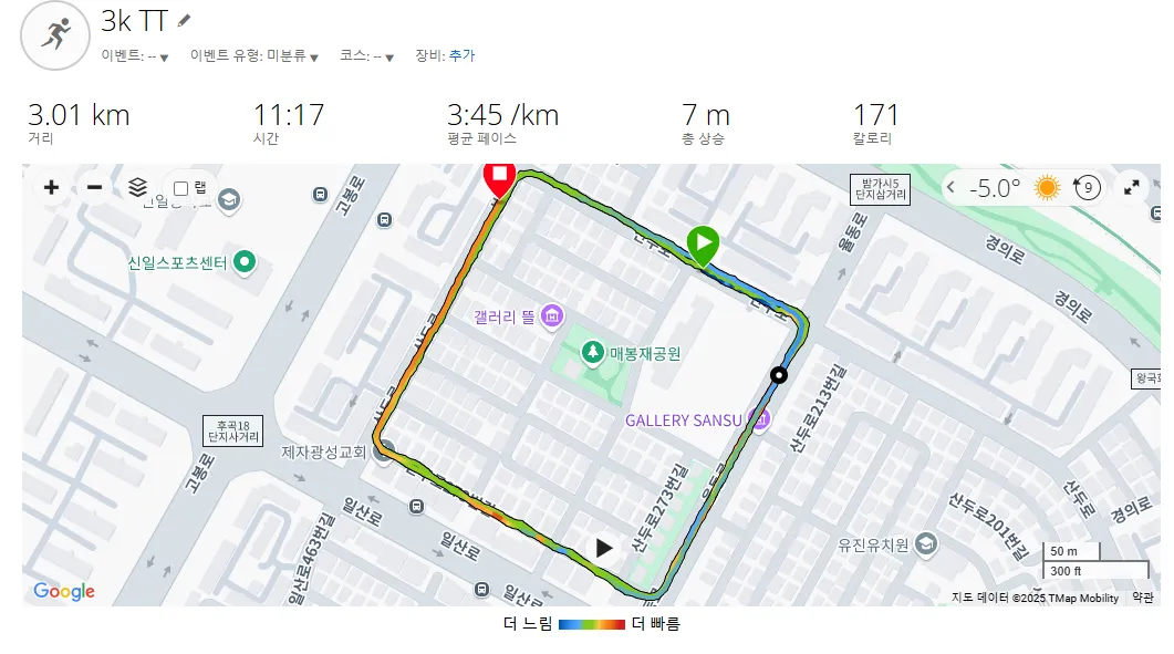 25년 첫 번째 3K TT 4키로 정도 웜업 후 도전 집 앞 네모 코스에서 오랜만에 시도해본다. 여수 대회가 코앞이다. 컨디션 조절에 힘쓰자