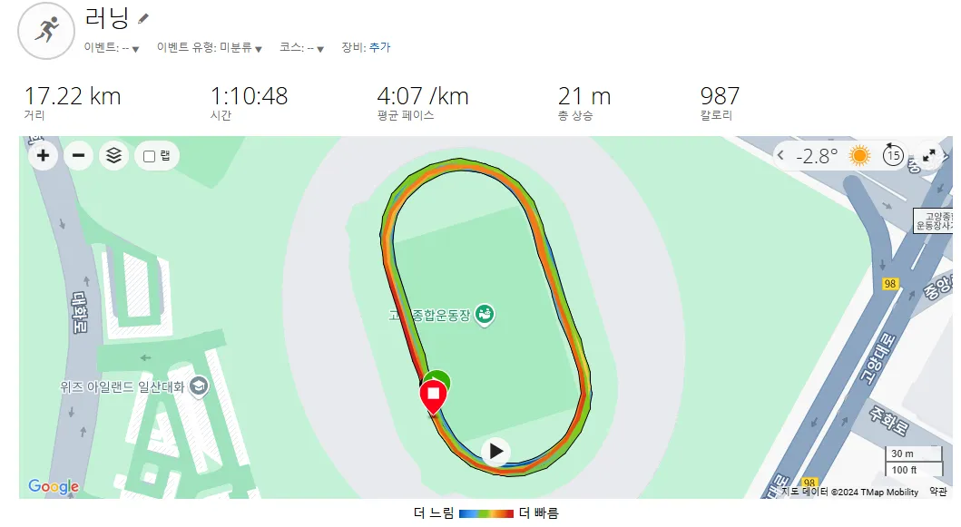 70분 페이스주 트랙을 빠른 속도로 유지하며 달리는건 집중력이 필요로 한다. 호흡과 팔치기, 앞 사람과의 간격등 세심하게 달려야 흐트러지지 않고 갈 수 있다.