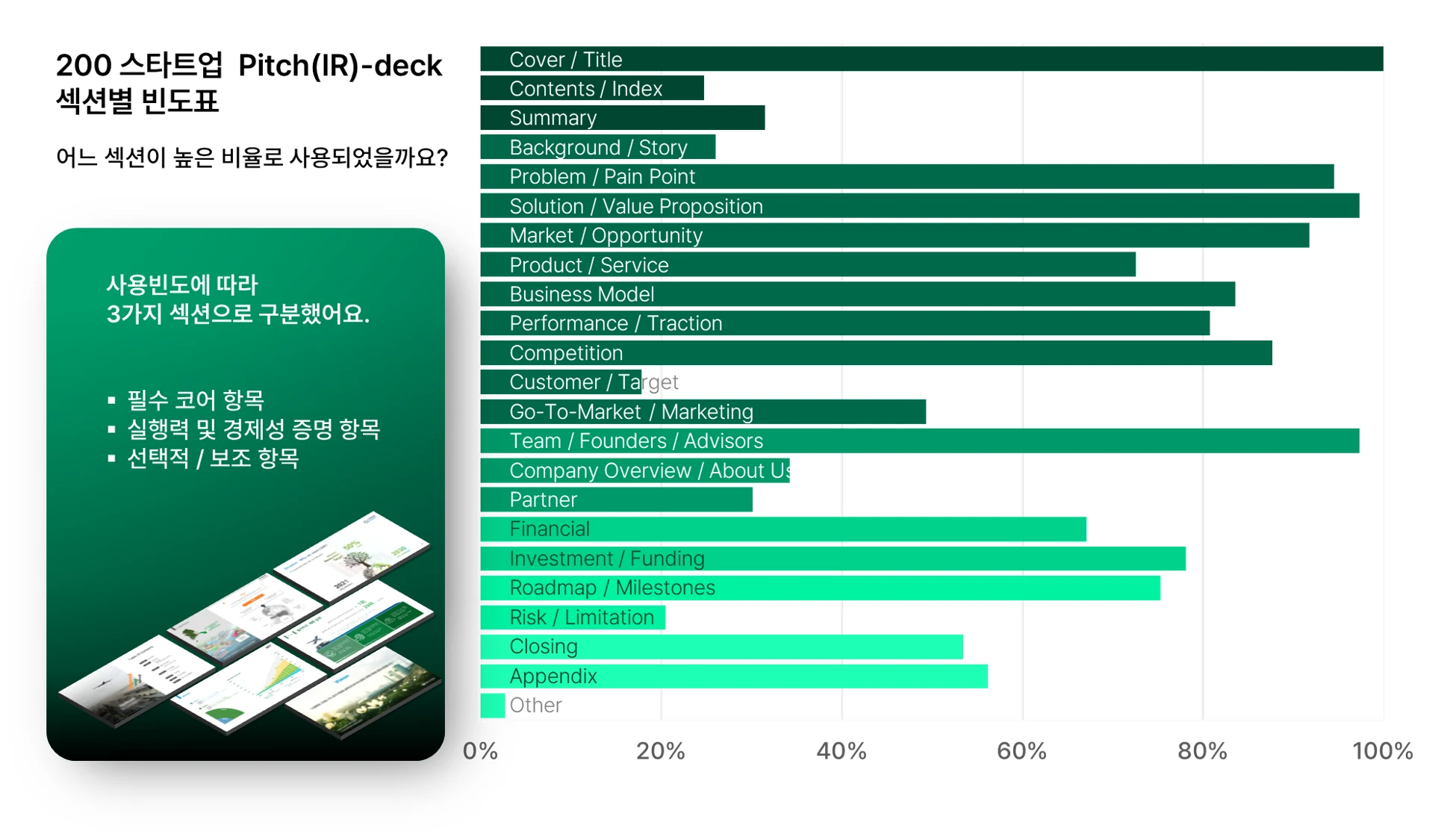 실제로 사용된 200여개의 Pitch(IR)-deck을 섹션별로 구분하여 분석해보았습니다.