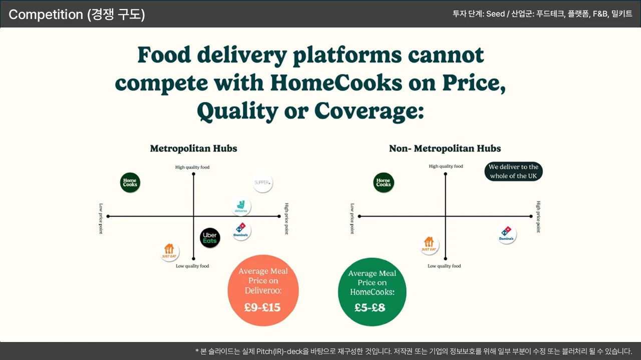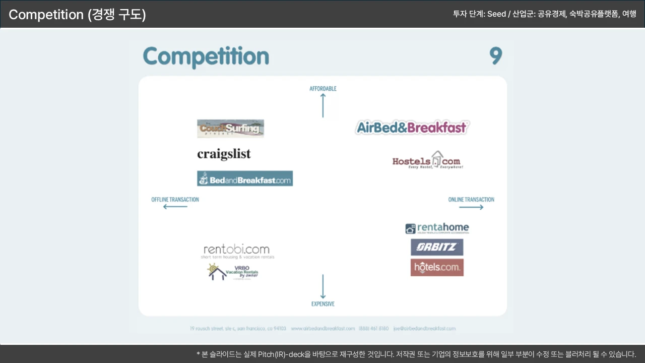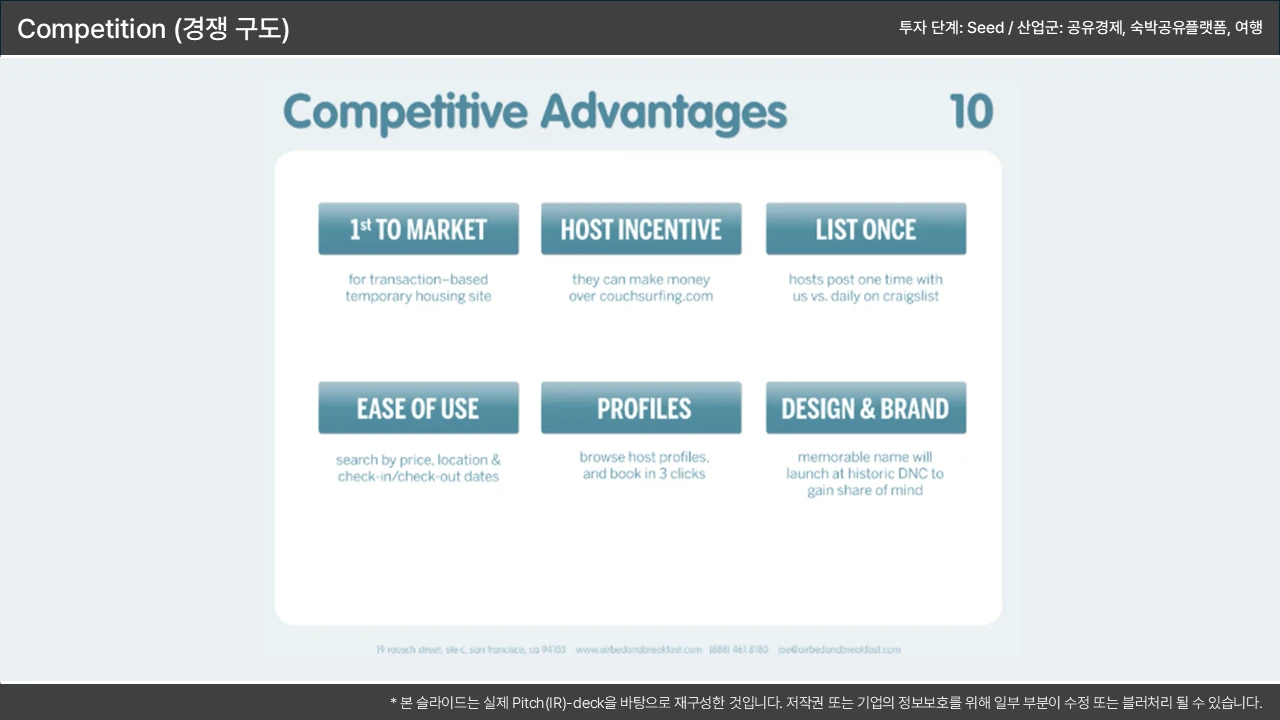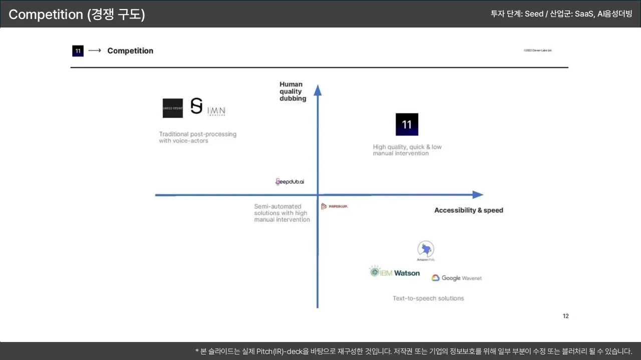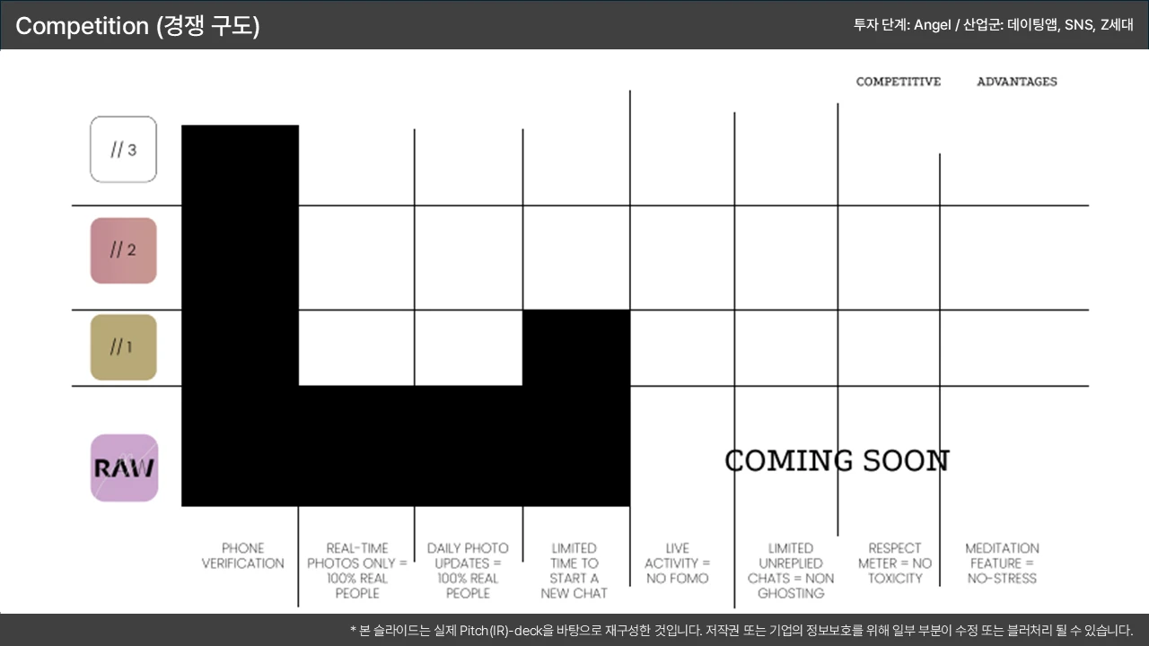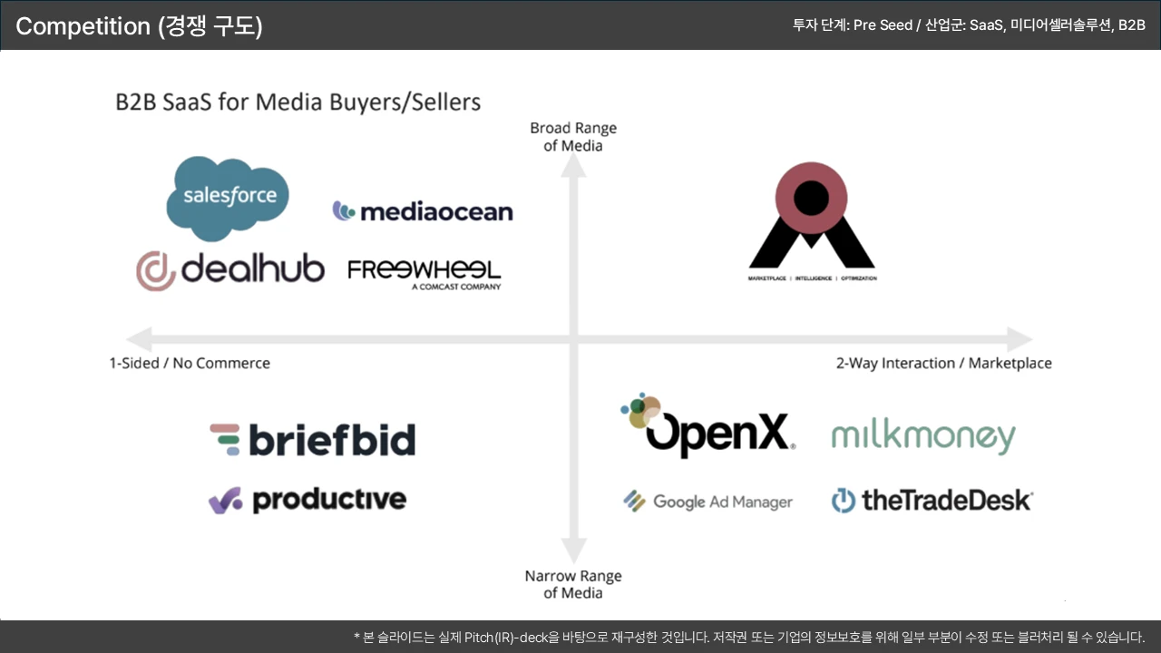 포지셔닝 맵(2x2 매트릭스) 활용: '우리 회사가 압도적인 우위(핵심 우위)를 가지는 축' 2개(예: 가격 vs. 성능)를 설정하고 우리가 우측 상단에 위치함을 시각적으로 표현 → 이 우위가 '기술적 해자(Moat)'와 연결됨을 시사