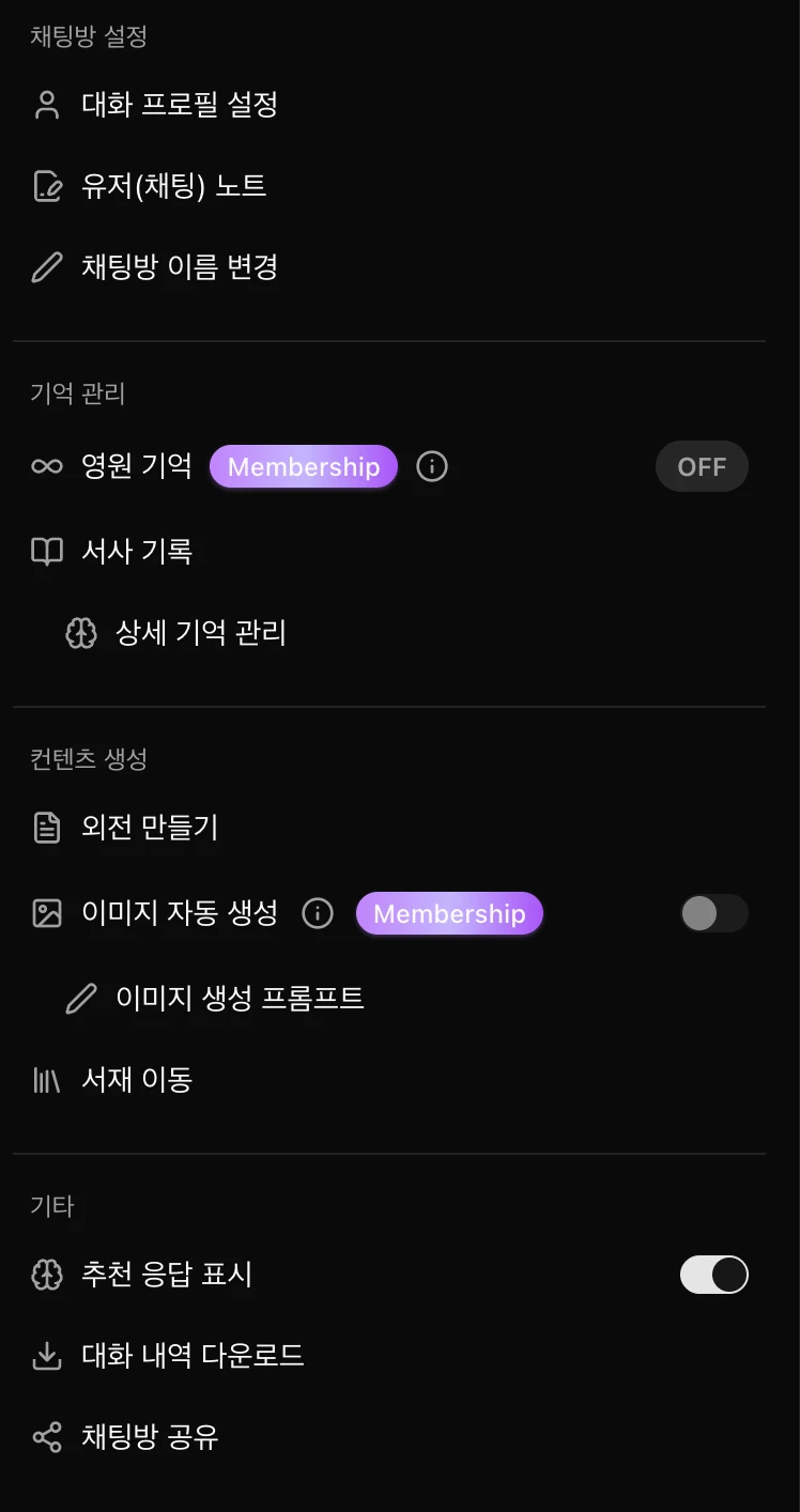 채팅방 메뉴에서 사용할 수 있는 다양한 기능들을 소개합니다. 이 기능들을 활용하여 AI 캐릭터와 더 풍부하고 즐거운 대화를 만들어보세요.