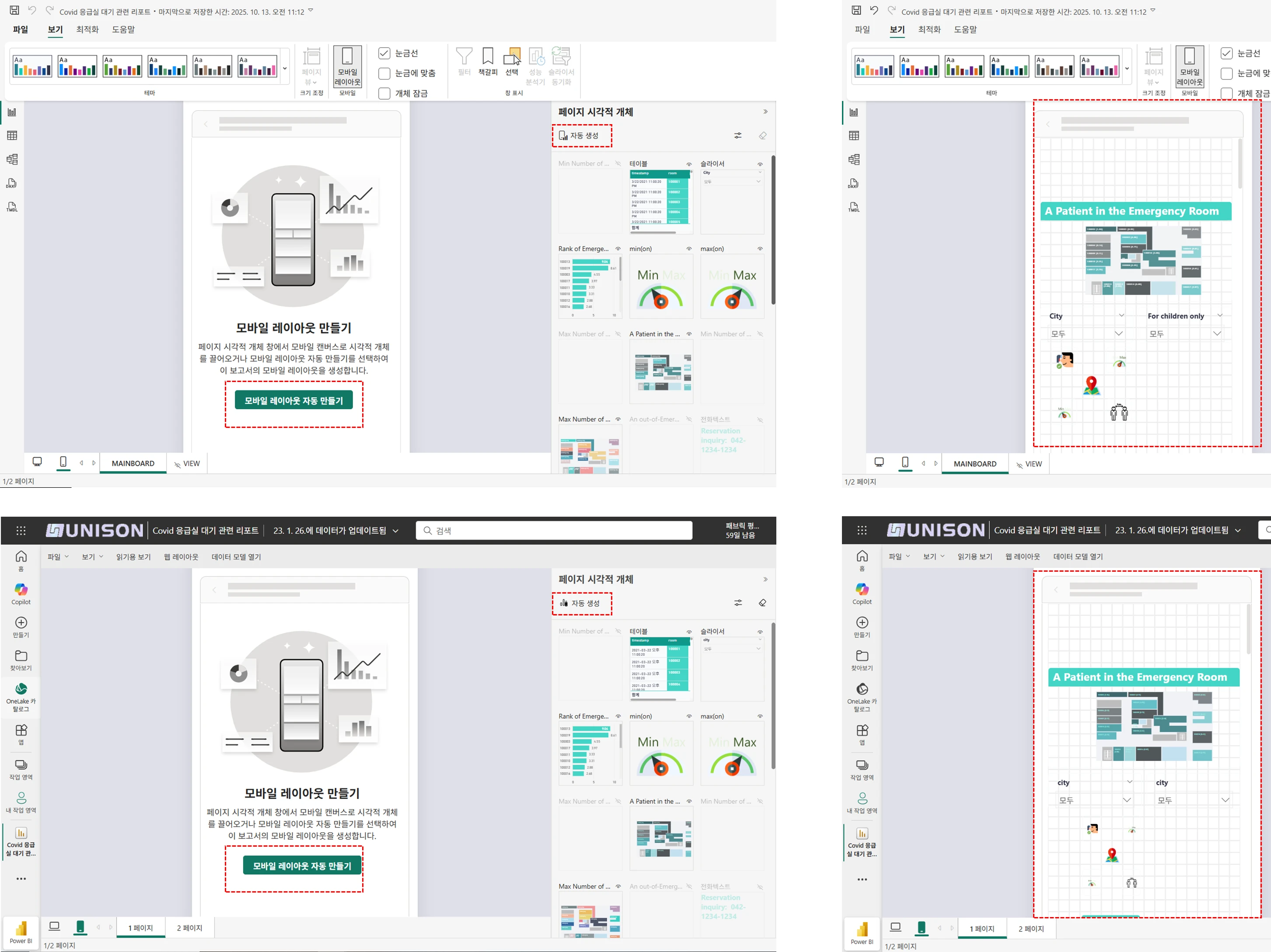 Power BI Desktop의 모바일 레이아웃(상), Power BI 서비스의 모바일 레이아웃(하), 자동 생성 결과(우)