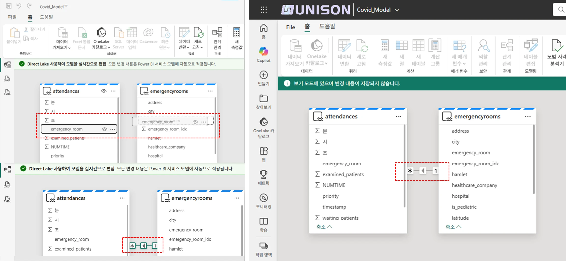 TMDL을 통한 의미 체계 모델 편집 시 전후 코드 차이 대조