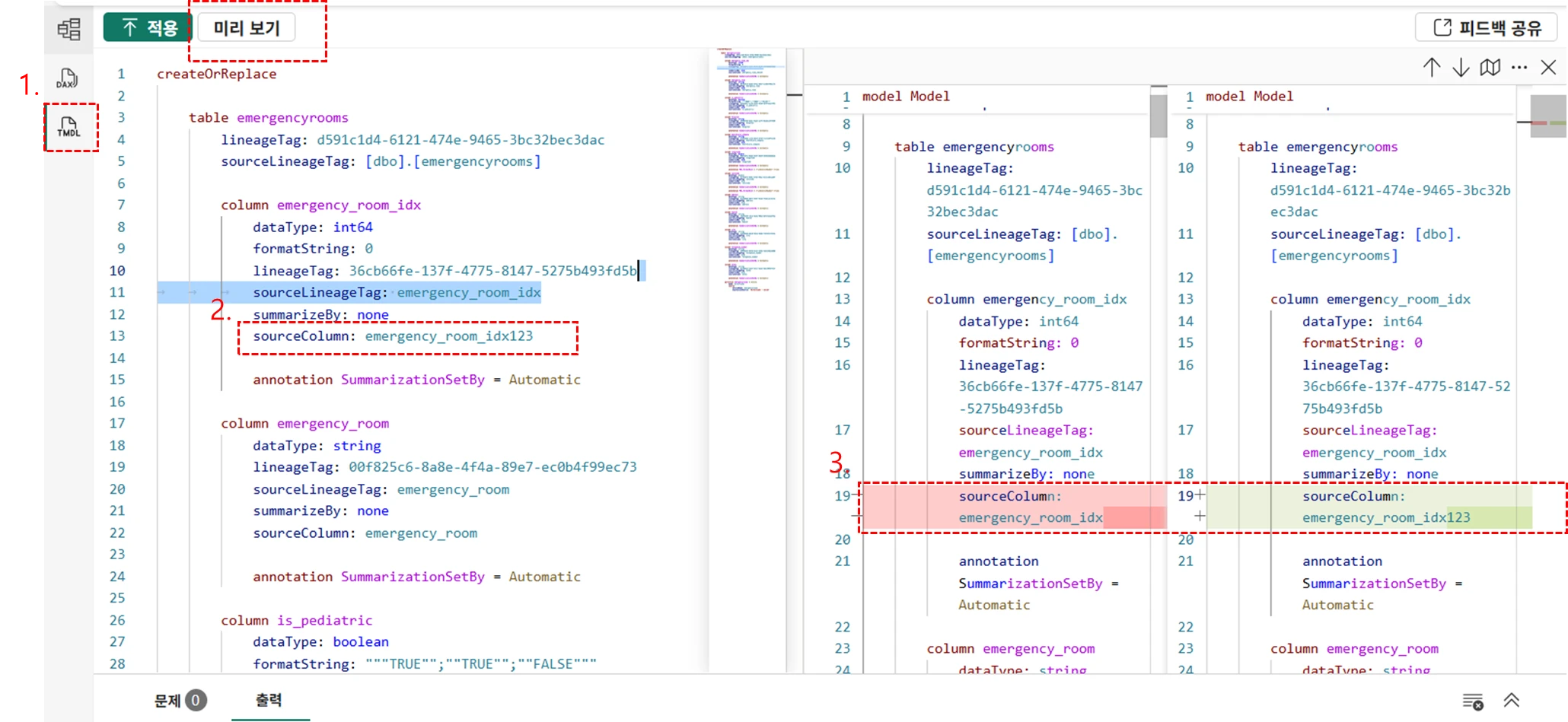 Power BI Desktop의 TMDL 탭(1번)에서 데이터 정의에 관한 스크립트를 수정(2번)하고 적용 하기 전 수정 전/후 상태를 비교(3번)함으로써 변경 사항을 평가할 수 있습니다.