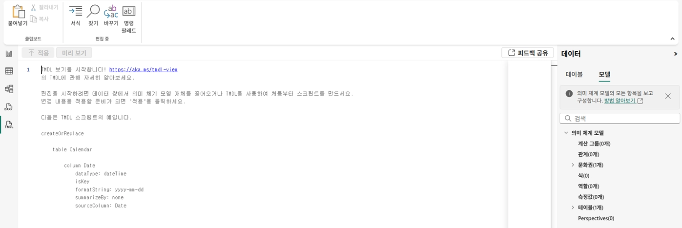 기존에 리본 메뉴나 옵션을 통해 진행했던 모델링을 TMDL(Table Model Definition Language) 뷰를 사용하여 의미 체계 모델링을 프로그래밍 방식으로 진행