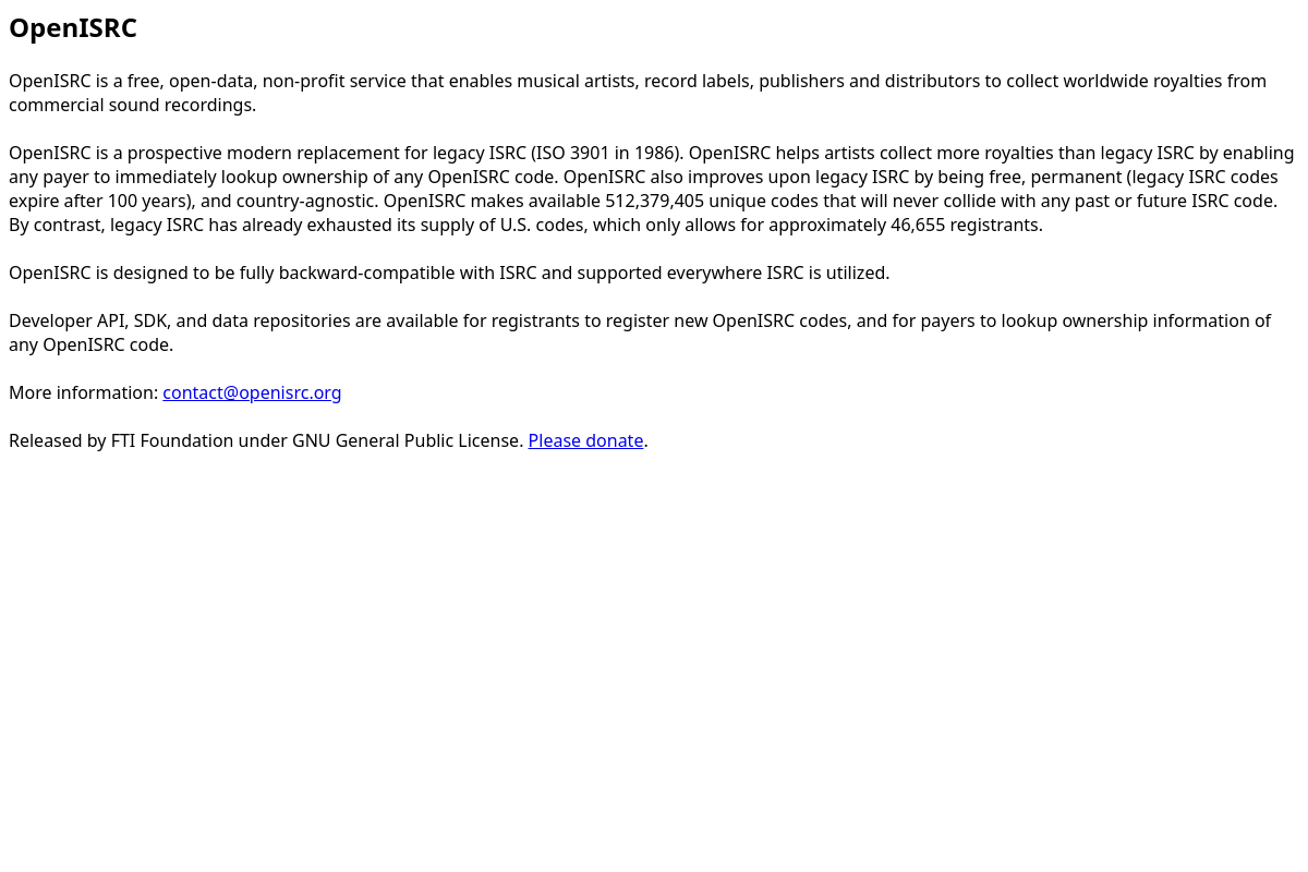 OpenISRC - OpenISRC is a free, open-data, non-profit service that enables musical artists, record labels, publishers and distributors to collect worldwide royalties from commercial sound recordings.