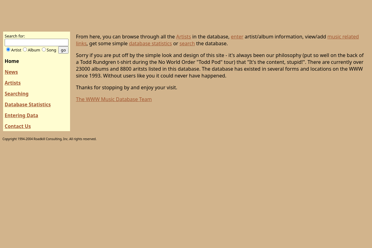 Online Music Database - From here, you can browse through all the Artists in the database, enter artist/album information, view/add music related links, get some simple database statistics or search the database.