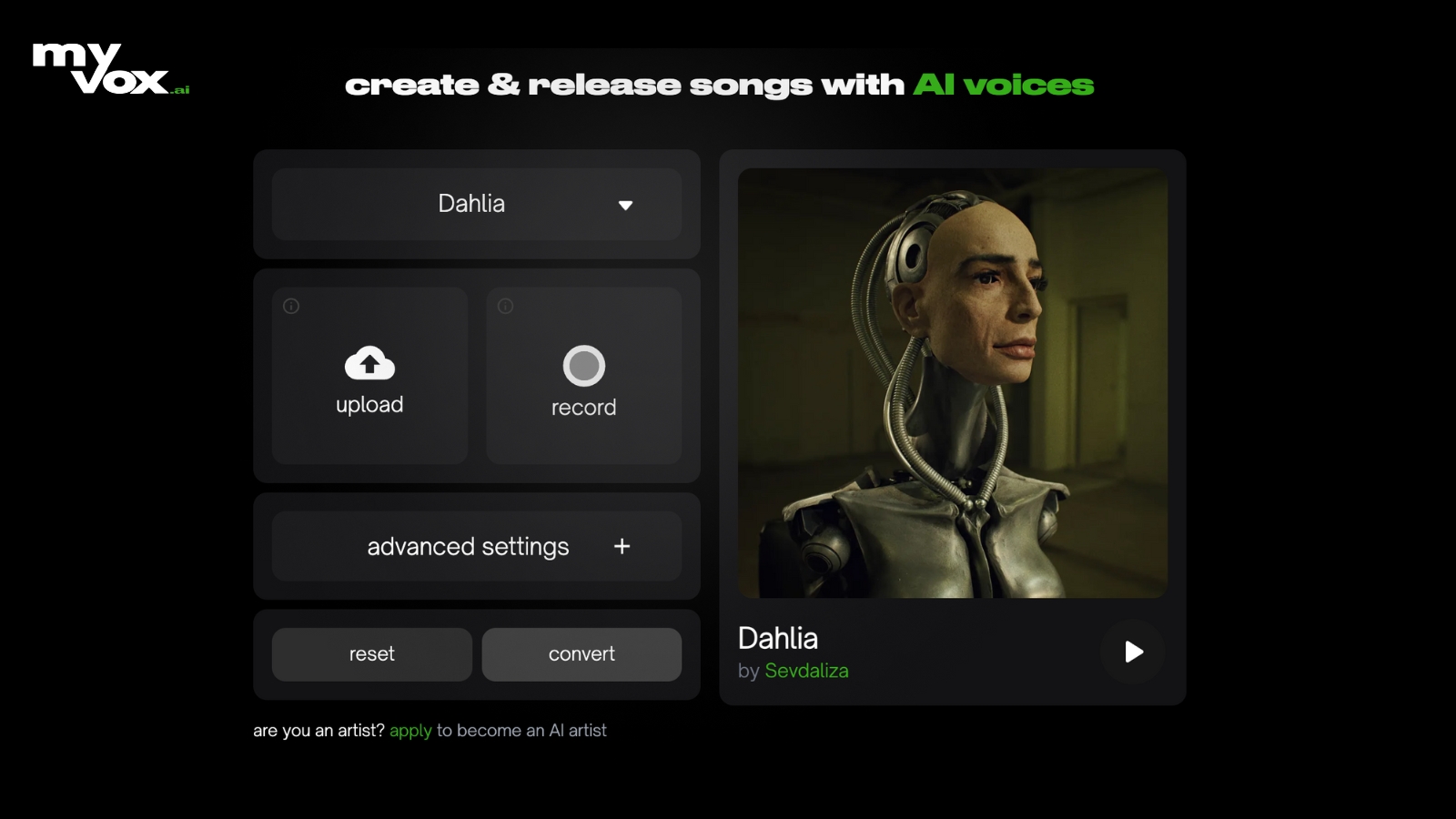 [myvox] (https://myvox.ai) - - Revolutionize music creation with myvox's AI voice conversion. Empowering artists, producers, and enthusiasts to unleash boundless creativity.