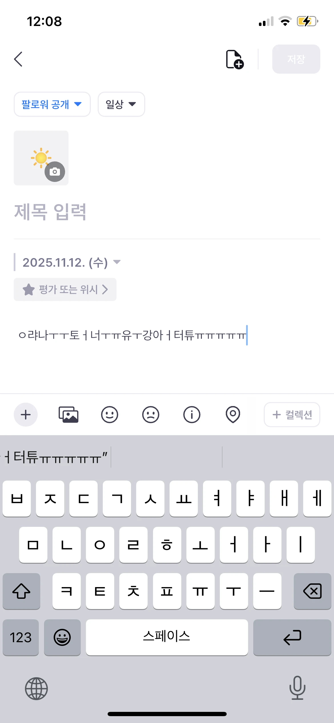 아이폰12pro . 일상 눌럿을때 뭘 써도 아예 저장 버튼이 비활성화되어서 안눌립니다...제발...저일기써야돼요