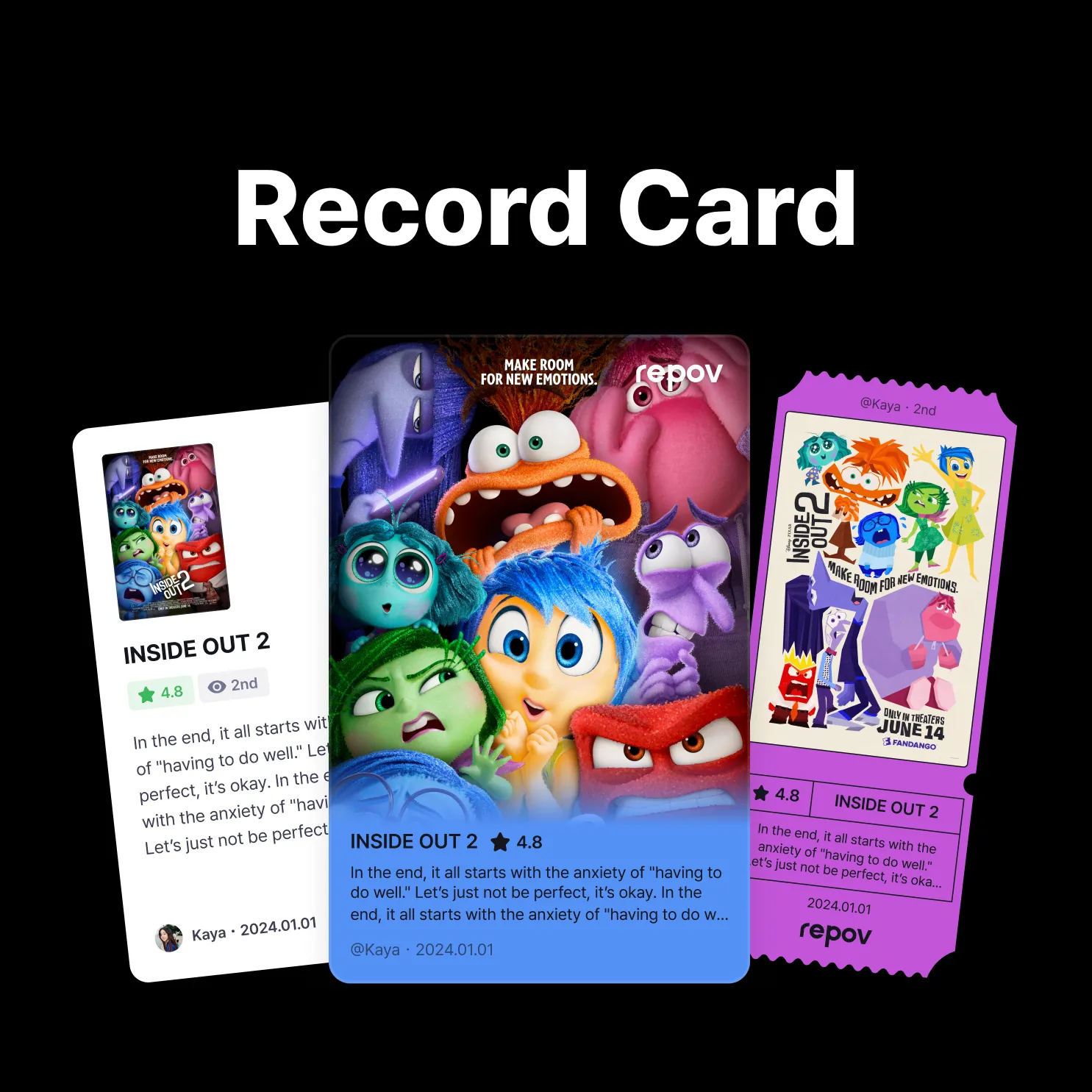 Turn your records into more beautiful cards and share them! Version 0.4.0 or higher You may need the latest update to use these features. (iOS | Android) We’ve prepared 3 types of record cards: Card - Choose image, aspect ratio, and content (record, quote) Photo Card - Choose color, poster image, aspect ratio, and content Ticket - Choose color, poster image, and content You can create record cards through the following steps: Create record cards right after recording! Click the record you want to turn into a card > press the button at the bottom!