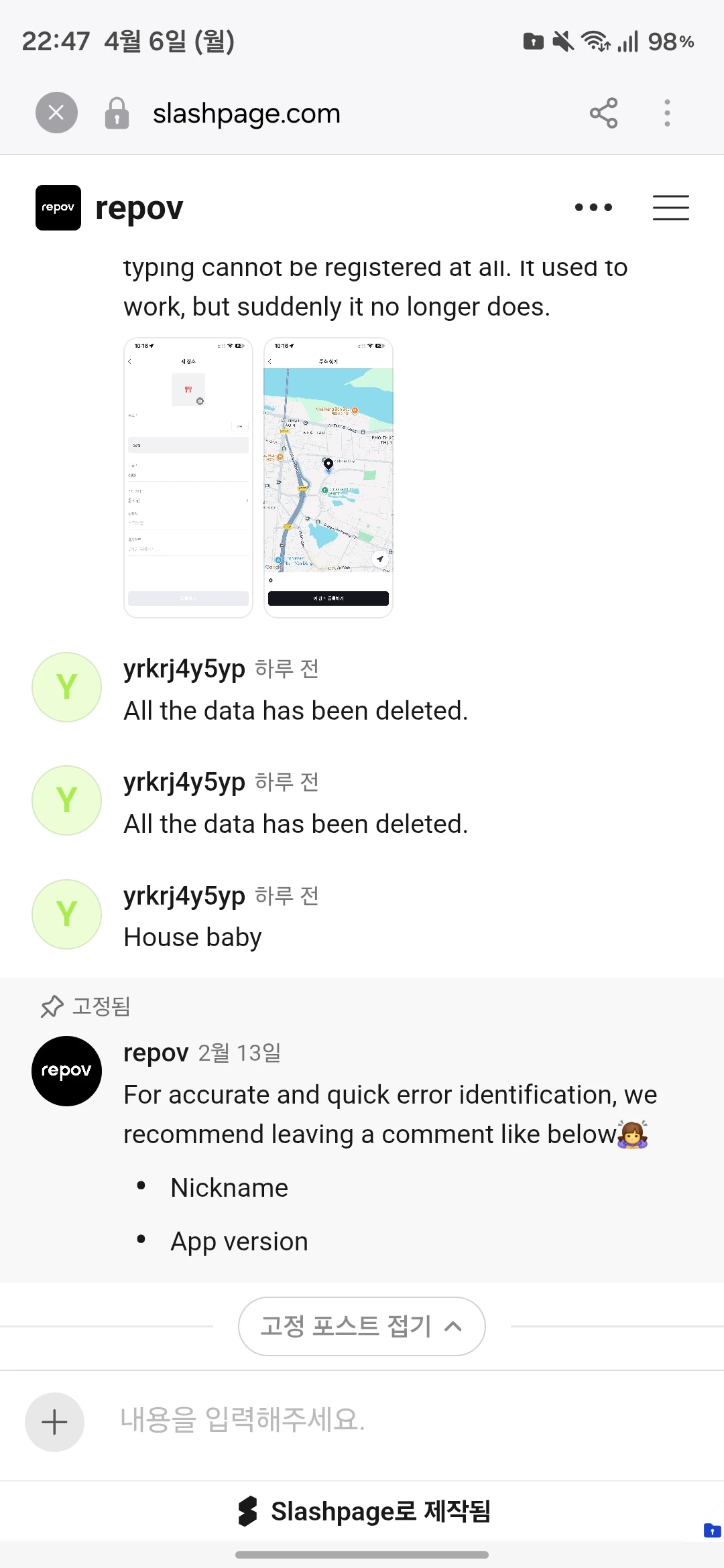 시스템언어가 한국어이고 앱 언어도 시스템으로 설정되어 있는데, 기능제안이나 오류제보 때문에 슬래시페이지에 들어가면 영어로 자동번역돼서 떠요