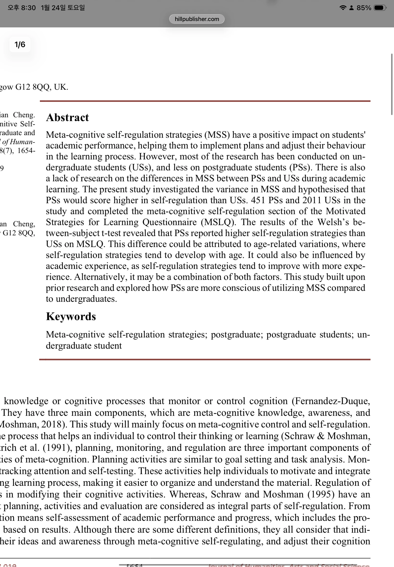 https://www.hillpublisher.com/UpFile/202408/20240813180759.pdf This research paper talks about differences in procrastination with two groups, postgraduate students (PS)s and undergraduate students (USs) with prediction of self regulatory in metacognition as a mediator. The research was based on online survey through about 700 students using MSLQ (Motivated Strategies for Learning Questionnaire) as a key. The research was solid about gap in procrastination is large. PSs are having higher ability in metacognition regulatory compared to Uss. The paper suggested that this is due to increase in academic literacy with more experiences in studying. Also, they mentioned misunderstanding in metacognition between students that procrastination increases creativity and higher quality in product. However, Ps students with more mastery-approach goal effects on the result in positive ways. Lastly, they mentioned active procrastination’s different point between two. Which conclude that PS students tend to use active procrastination by high self-efficacy while the others do active procrastination because of low enthusiasm and self regulatory. In my opinion, it is hard to confirm one concept as an all reason in decrease in procrastination as people get old. In that aspect, I liked how the research paper suggested difference hypothesis that might have caused academic procrastination in students in younger age.