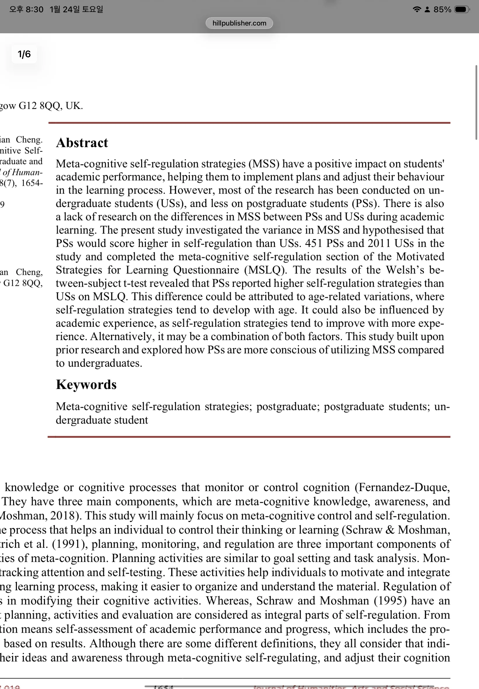 https://www.hillpublisher.com/UpFile/202408/20240813180759.pdf This research paper talks about differences in procrastination with two groups, postgraduate students (PS)s and undergraduate students (USs) with prediction of self regulatory in metacognition as a mediator. The research was based on online survey through about 700 students using MSLQ (Motivated Strategies for Learning Questionnaire) as a key. The research was solid about gap in procrastination is large. PSs are having higher ability in metacognition regulatory compared to Uss. The paper suggested that this is due to increase in academic literacy with more experiences in studying. Also, they mentioned misunderstanding in metacognition between students that procrastination increases creativity and higher quality in product. However, Ps students with more mastery-approach goal effects on the result in positive ways. Lastly, they mentioned active procrastination’s different point between two. Which conclude that PS students tend to use active procrastination by high self-efficacy while the others do active procrastination because of low enthusiasm and self regulatory.