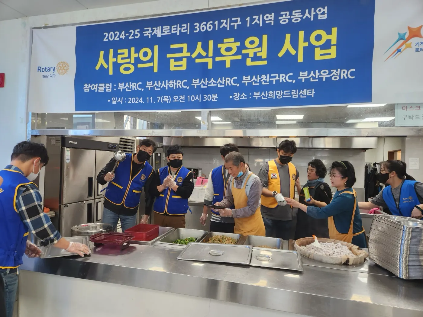 [활동 요약] 일시: 2024년 11월 7일 (목) 오전 10시 30분 장소: 부산희망드림센터 참여클럽: 부산RC, 부산사하RC, 부산소친RC, 부산친구RC, 부산우정RC '초아의 봉사'라는 하나의 뜻으로 여러 클럽이 마음을 모았습니다. 쌀쌀한 바람이 불기 시작한 지난 11월 7일, 부산로타리클럽은 3661지구 1지역(부산, 부산사하, 부산소친, 부산친구, 부산우정RC) 회원들과 함께 '사랑의 급식후원 사업'에 동참했습니다. 부산희망드림센터에서 진행된 이번 공동 봉사는 지역 내 어르신들과 이웃들에게 따뜻한 한 끼 식사를 대접하기 위해 마련되었습니다. 로타리 회원들은 이른 아침부터 모여 정성껏 음식을 준비하고, 센터를 찾으신 분들께 밝은 미소와 함께 따뜻한 밥과 반찬을 배식했습니다. 든든하게 식사하시는 어르신들의 모습을 보며 봉사에 참여한 회원들의 마음 역시 훈훈함으로 가득 찼습니다. 함께할 때 봉사의 기쁨은 배가 됩니다. 부산로타리클럽은 앞으로도 여러 로타리 클럽 및 지역사회와 연대하여 소외된 이웃 없이 모두가 따뜻한 공동체를 만드는 데 앞장서겠습니다. 1지역 공동사업에 함께 땀 흘려주신 모든 로타리안 여러분께 감사드립니다.