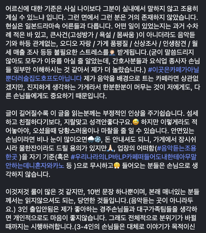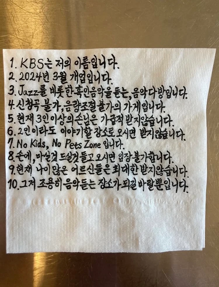 집으로 돌아와 카페 KBS 인스타를 팔로우하고 거기에 있는 공지(위의 캡처)를 읽자마자 골치 아픈 생각 그만두기로 했다. 브랜딩은 결국 구분짓기의 언어이고, 공간도 마찬가지다. 모두를 적당히 만족시키는 공간보다 원하는 사람에게 미친 만족을 주는 공간, 제품, 브랜드가 내 기준에서 훨씬 멋진 공간이다. 옆 사람의 전화 통화 소리를 들어야 하고, 아이가 울고 개가 짖고 무례한 노인네가 호통치는 공간에서 조금 아쉬운 마음으로 카페 문을 나서는 것보다 오롯이 음악에만, 내가 집중하고 싶은 만큼 집중하다 나올 수 있는 공간이 PC하진 않더라도 훨씬 멋지고 귀하다. 난 어떤 공간을 만들어야 할까. 업장이든 사적인 공간이든 내가 좋아하는 것들만 내 공간에 들이며 사는 삶, 혹은 싫어하는 것을 눈치보지 않고 마음껏 배제하며 사는 삶을 살 수 있을까. 삶의 목표가 생긴 기분이 들었다.