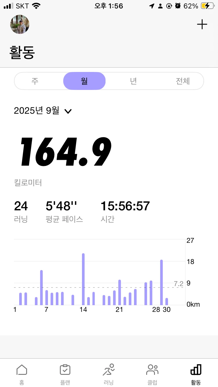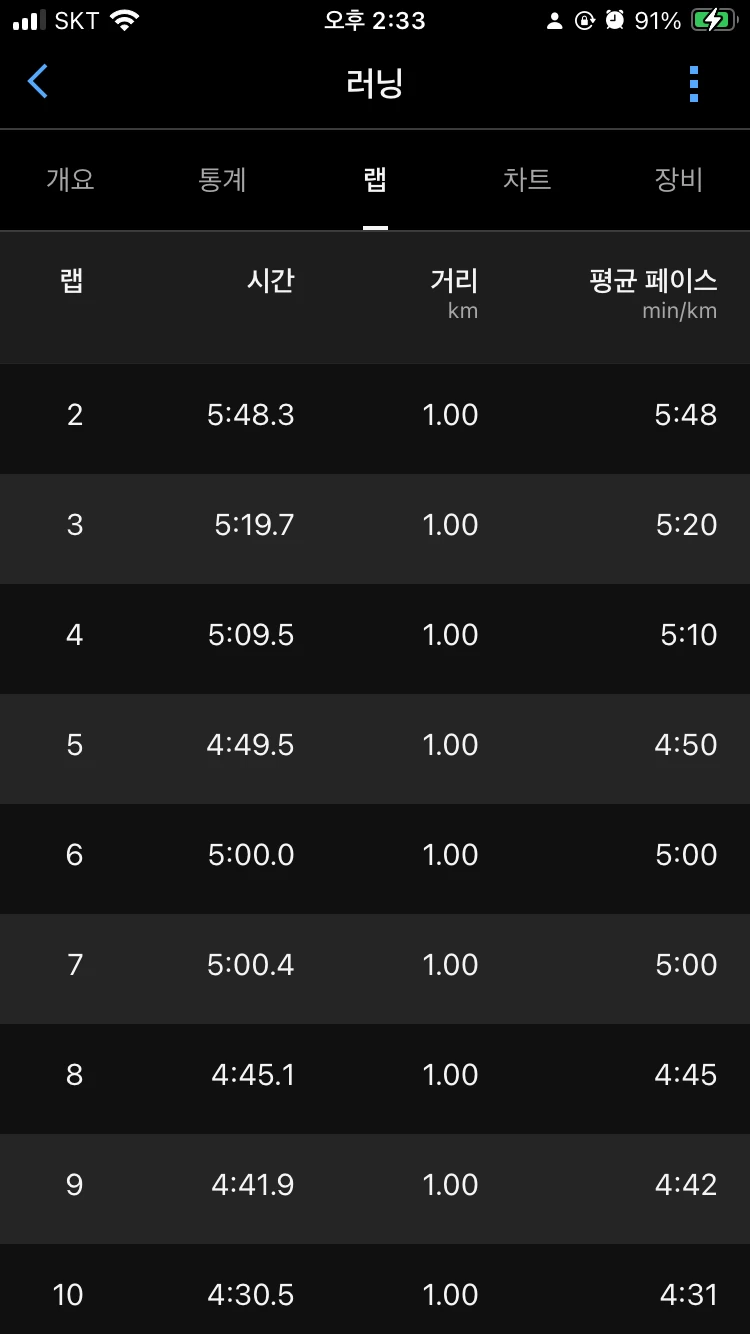 7월 마지막주부터 특별한 이유가 없으면 매일 달리고 있다. 대신 거리를 줄였다. 보통은 3k, 컨디션 좋으면 5k, 주말에는 몸 상태나 기분에 따라 10k 이상 뛰는 루틴이다. 속도나 거리를 채우는 것보다는 기분 전환과 명상, 컨디션 조절을 위해 뛰는 것으로 마인드셋을 바꿨다. 8월과 9월의 기록이다. 10월의 시작은 제주도에서 새벽에 일어나 뛰었을 때의 기록. 너무 이른 새벽이라 길이 깜깜해서 달리기 어려웠지만 꿋꿋이 거리를 채웠다. 여행지에서 달리는 건 늘 기분 좋다. 하지만 자연의 새벽은 정말 깜깜하다는 걸 배웠다. 전날 제주도에 비가 많이 내렸는데 이날은 화창했다. 연동에 있는 숙소에서 제주종합경기장까지 가려다 가는 길에 있던 제주중앙중학교 트랙에서 뛰었다. 간만에 트랙이라 일정한 속도와 자세를 신경쓰며 뛰었다. 숙소까지 돌아오는 거리가 약 1k 정도여서 천천히 리커버리런 하며 돌아왔다. 아름다운 퀄리티의 제주중앙중학교 트랙. 서울로 돌아오니 주문해둔 EVO SL이 도착해있었다. 안정화 계열인 뉴발란스 860 v14가 마일리지 550k를 채워 거의 수명을 다하기도 했고 재미있는 훈련화를 신어보고 싶어서 주문했다. 안정화는 확실히 안정적이고 단단하긴 한데 마일리지가 쌓일 수록 젖은 시멘트 같은 느낌이 있어 재미가 없다. 컬러웨이가 다양했는데 고민끝에 녹색+실버 조합으로 선택했다. 디자인 자체가 재미있어 특이한 색조합으로 가보고 싶었다. EVO SL 신고 첫 러닝은 올림픽 공원에서. 빨리 뛸 생각은 없었는데 새 신발의 반발력이 좋다보니 점점 가속이 붙었다. 굳이 제어하면서 뛰기보다 신나게 뛰어보자 싶어 계속 더 밀고 나갔다.