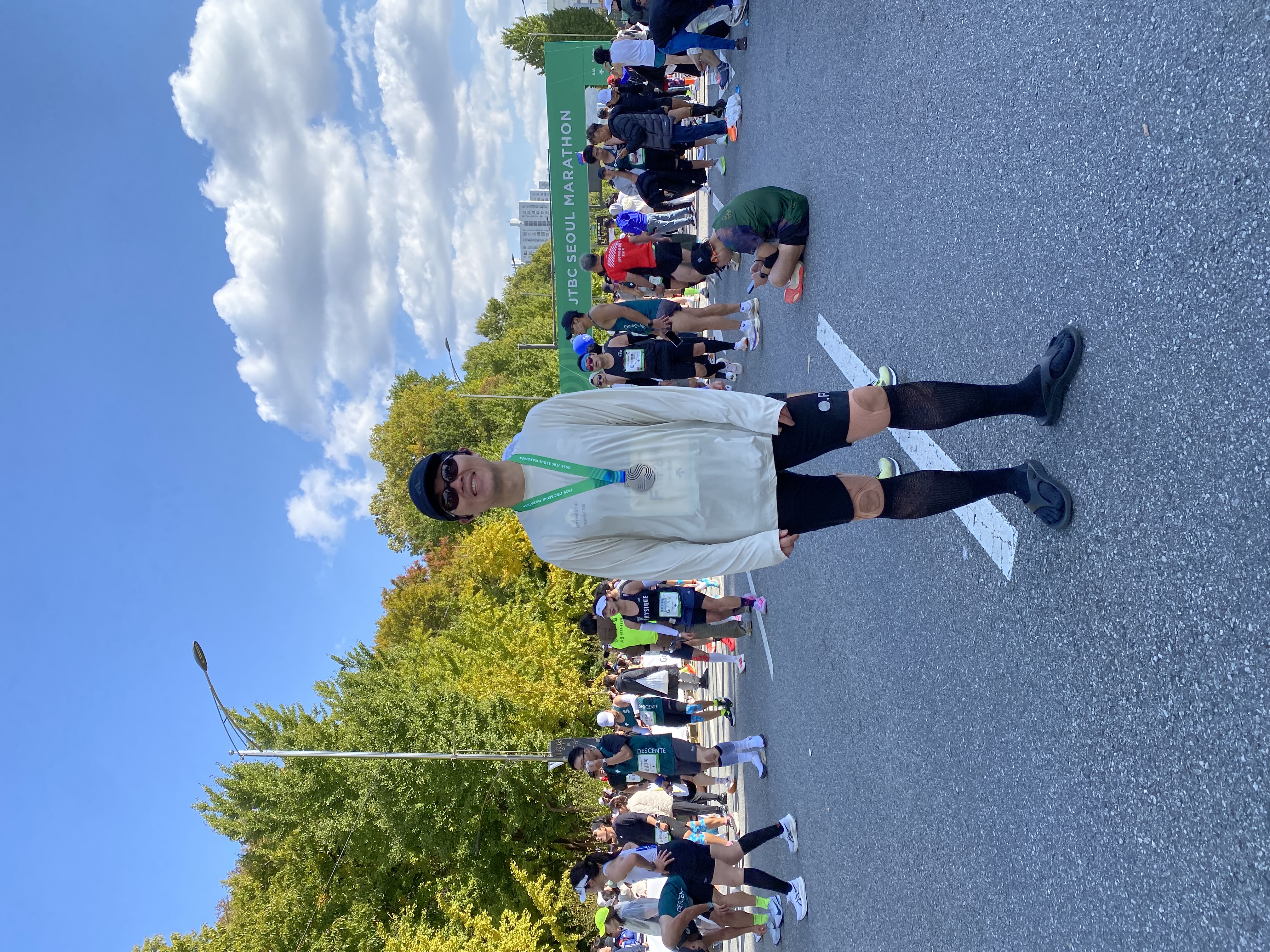 뛰고 나서 42.195km를 뛰었다. 궁금했다. 내가 완주할 수 있을까? 뛰고 나면 어떤 기분일까? 얼마나 걸릴까? 뛰었지만 궁금함이 해결된 느낌은 아니다. 그냥 많이 힘들다는 느낌밖에 없었다. 누군가는 벅차서 눈물을 쏟거나 바닥에 쓰러지던데 그정도로 간절하진 않았나보다. 뛰기 하루 전날 선희한테 말했다. 마라톤 완주하고 나면 나는 마라톤 완주한 내가 되는 거라고. 근데 그냥 나와 마라톤 완주한 나는 뭐가 다르지? 레이스 당일 전날 일찍 잠들어서 새벽 4시 전에 일어났다. 알람을 4시에 맞춰두었는데 알람 소리 나기 전에 눈이 떠졌다. 어제 챙겨둔 짐을 한번 더 확인하고 미리 잘라둔 근육 테이프로 무릎과 허벅지, 종아리에 꼼꼼하게 테이핑을 붙였다. 선희가 탁센을 챙겨두었다. 뛰기 전에 한 알, 뛰다 무릎에 느낌이 오면 한 알 먹을거다. 무릎이 좀 아파도 참고 뛸 생각했다. 상암까지 꽤 먼 길이다. 경찰병원역에서 출발하는 3호선 첫 차는 5시 17분에 온다. 첫 차 타고 약수로 가서 3호선으로 환승해야 한다. 오늘 대회 나가는 러너들이 몇명 보였다. 3만 5천명이 모여서 서울을 가로지른다는 게 말이 그렇지 진짜 엄청난 이벤트다. 뭔가 수상해보이는 패션... 그래도 아침엔 좀 춥다. 약수에서 6호선 환승하니 그냥 러시아워의 2호선이나 마찬가지였다. 월드컵경기장역은 거의 뭐 북새통이었다. 역에서 나오니 어둠이 걷히고 있었다. 화장실 들렀다가 옷 갈아입었다. 싱글렛 위에 우의 입었다. 우의는 입고 있다가 웜업 되면 벗어서 주로에 있는 쓰레기통에 넣는다. 짐 맡기고 경기장 주변을 천천히 뛰었다. 심박이 평소보다 좀 빨리 오르는 느낌이라 불안했지만 그런 생각은 접어두기로 했다. 출발 직전 모르는 아저씨 사진 찍어드렸는데 그분이 보답으로 나도 찍어주셨다. 풀코스 기록이 없어서 F그룹에 배정되었다. A그룹부터 G그룹 순서로 달린다. 출발 전에 버핏서울팀에서 나와 준비운동 했는데 몸이 금방 더워져서 우의 벗었다. 우의는 출발 전에 인도쪽에 벗어서 버리라고 계속 방송이 나왔다. 달리다 중간에 버리면 뒤에 따라오던 주자가 걸리거나 미끄러질 수 있어서다. 뒷 그룹이라 지겹게 오래 기다릴 줄 알았는데 생각보다 금방 출발했다. 이 사진이 완주하기 전에 찍은 마지막 사진이다. 레이스 완주가 목표라고 했지만 내심 3시간 50분 정도에 들어올 생각했다. 아예 완주 못할 수도 있지만 완주하면 sub 4는 할 것 같았다. 인스타에 너도 나도 sub 4, sub 3 기록을 인증하는 세상이라 나라고 못할 거 없다 싶었다. 3시간 50분에 들어오려면 km당 5분 30초 안쪽 페이스로 뛰어야 한다. 초반 5km 까지는 5분 40~50초 페이스로 뛰어보면서 몸 상태에 따라 페이스를 올리거나 목표를 수정하기로 한다. 어차피 초반에는 병목 때문에 마음껏 뛰지도 못한다. 상암에서 합정으로, 공덕까지 한강 다리를 두번 건너면서 한껏 기분이 좋아졌다. 페이스가 자꾸 빨라져서 일부러 조절하면서 뛰었다. 응원하는 사람들도 다들 기분 좋아보였다. 공덕을 지나 종각, 광화문을 지날 때는 이런 날씨에 서울을 가로질러 뛸 수 있다는 게 감사하다는 생각까지 들었다. 광화문에서 신설동으로 내려가는 동안에는 예전에 선희랑 신혼 생활 할 때 생각도 하고(그때 신설동에 살다 은평구로 이사갔었다) 올해 초 YMCA 하프마라톤에서 광화문에서 신설동 가는 코스가 멀게만 느껴졌던 생각도 났다. 그때 생각하며 더 천천히 길게 생각하면서 뛰자고 마음 먹었다. 하프 거리 정도를 지나자 이대로면 풀코스 괜찮겠다 싶었다. 물론 교만한 생각이었다. 30km 부터 진짜 시작이라는 말을 너무 많이 들었다. 심지어 GPT도 그렇게 말했다. 그런데 30km 까지도 괜찮았다. 물론 조금씩 힘든 느낌은 있었지만 견딜만한 수준이었다. 잠실대교를 지나 롯데타워가 보이기 시작하자 이제 집에 다 왔다는 생각도 들고 레이스가 끝나간다는 게 아쉽기도 했다. 잠실대교 지나 우회전해서 학여울역으로 가는 길부터가 진짜들의 시간이었다. 이때부터 응원 소리에 호응하기도 쉽지 않았다. 그래도 내 배번호에 써 있는 이름 불러주는 분들 있어서 너무 감사했다. 학여울역으로 가는 길이 살짝 오르막인데다, 유턴해서 돌아오는 사람들이 멀리 아득하게만 보여 급격하게 지치기 시작했다. 길가에서 샤인머스캣 포도알 나눠주시는 분, 레몬 조각 나눠주시는 분들이 있어 받아 먹었다.(감사합니다) 7km 마다 에너지젤을 먹을 계획이었으나 35km 되기 전 33km에서 먹고, 30km에서 보너스로 받은 에너지젤은 38km에서 먹고 마지막 힘을 짜내기로 했다.