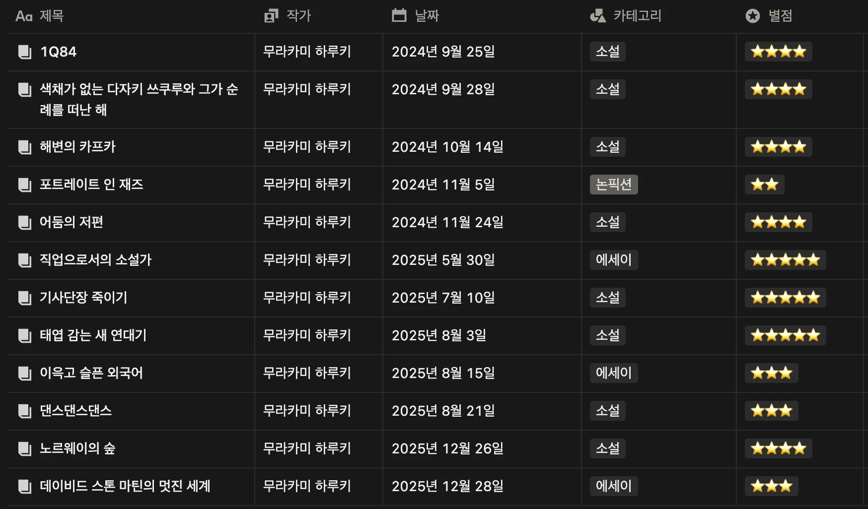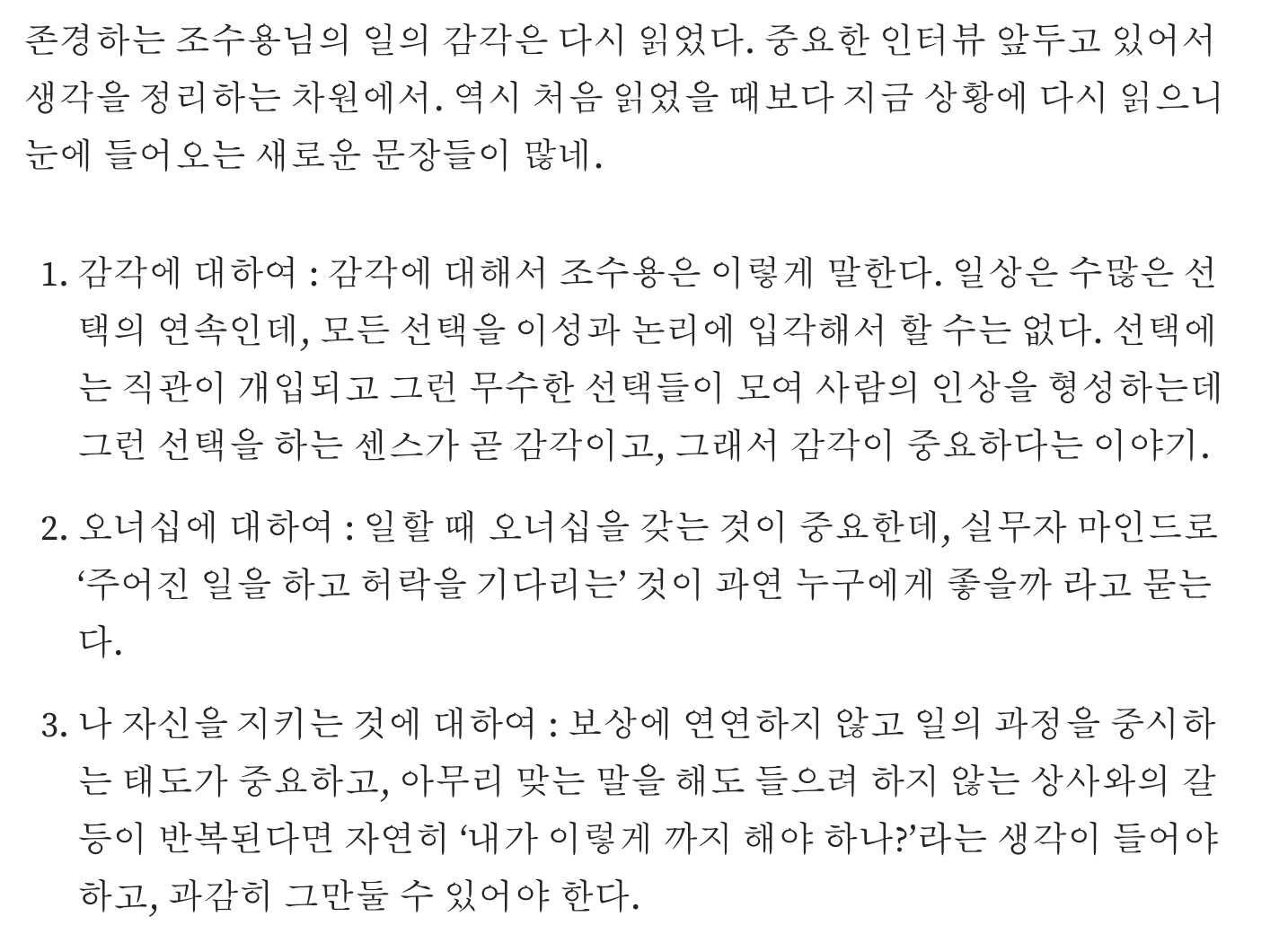 재작년 12월 31일에 인스타에 '사진을 가장 안 찍은 해였는데, 그럴수록 더 소중한 순간들만 사진첩에 남아 있는게 우습다'고 썼었는데 올해는 사진도 대충대충 많이 찍고 사람들도 많이 만난 해였다. 내가 진짜 원하는 것에 대한 생각도 많이 해봤다. 지금 생각해보면 예전의 나는 뭐가 그리 못마땅한게 많고 힘들었나 싶다. (지금 그렇지 않다는 것은 아니다) 나라는 인간을 이루는 생각의 틀이라는 게 있다면 올해 가장 달라진 것은... 사람은 결국 혼자 살아갈 수 없고 누군가에게 의존하거나 의존할 수 있는 존재가 되어주며 살아가야 한다는 것, 그런 존재가 되어야 한다는 자각을 했을 때 비로소 자립할 수 있게 된다는 생각을 하게 되었다는 점이다. 수많은 점들이 이어지듯이 지금의 나는 수많은 의존들의 결과라는 사실을 알게 되었다. 그렇기에 더 확고해진 생각은... 그냥 지금 눈앞의 문제들을 최선을 다해 해결하자는 것이다. 누군가는 눈앞의 문제에 급급해선 안된다고 할 수도 있겠지만, 나는 멀리 앞을 내다볼 수 있는 훌륭한 인간이 아니기에 내 능력 안에서 할 수 있는 최선을 다하는 것이 결국 눈앞의 문제에 급급하는 것이다. 그렇게 뭐라도 하다 보면 조금씩 앞으로 가고, 친구나 동료들의 신뢰 내지는 동정을 얻게 되고, 그 크레딧으로 더 갈 수 있게 되는 게 결국 살아가는 것 아닌가 한다. 올해의 달리기 가장 꾸준히 달린 한해였다. 처음으로 풀코스 완주도 했다. 특별히 어려운 부상도 없었다. 더 빨리/더 오래/더 많이 뛰고 싶다는 생각이 사라졌기 때문이 아닌가 한다. 올해는 정말 ‘그냥’ 뛰었다. 뛰는 것 자체에 특별히 의미를 부여하지 않아도 충분히 의미 있는 일임을 알게 되었다. 6월에 부상은 아니고 장염+위염을 크게 앓았는데 그때 제외하고는 아침마다 별 일 없으면 나가서 뛰었다. 뛰는 게 그냥 하는 행위, 일상이 되니 뛸 때마다 스토리에 인증한다는 이상한 강박도 사라졌다. 뛰기 위해 일부러 더 일찍 일어나거나 한 것도 아니고, 어차피 3k~5k 정도 15분~30분 정도 뛰는 정도라 그냥 망설임이나 잔동작을 줄이는 것만으로도 뛸 시간은 충분했다. 아침 달리기를 시작한 초반 2~3개월에는 출근 후 오전 시간 컨디션이 부쩍 좋아지는 것을 느꼈다. 하지만 그 상태에 몸이 금방 적응 되어 지금은 뛰었을 때 좋다는 느낌보다 뛰지 않은 날 뭔가 몸이 무겁다는 느낌이 든다. 다시 말하면 뛰었을 때 좋아진다는 느낌보다는 나쁘지 않은 상태를 유지한다는 느낌이 더 크다. 좋고 나쁘고를 떠나서 올해 들어 달리기는 나에게 일종의 영적 행위 같은 것이 되었다. 독실한 신자가 아침에 기도를 올리듯 그냥 뛰는 거다. 종교는 잘 모르지만 매일 기도하는 사람이 매일 다른 뭔가를 바라고 기도하진 않을 것 같은데(아닌가...) 내 달리기도 마찬가지다. 달리는 행위 자체로 매일 어떤 긍정적인 변화를 기대한다기 보다 그냥 하는 거다. 그게 내 마음이 더 편하니까. 그래서 얼마나 더 빨리/오래/많이 뛰는지는 이제 별로 중요하지 않다. 그냥 뛰었나/안 뛰었나만 의미가 있다. 올해 가장 좋았던 러닝 코스는 해운대 블루라인파크 따라 송정해수욕장까지 갔다 돌아오는 10k 코스다. 이날 8월 17일이어서 정말 매우... 개같이... 더웠는데 그래도 새벽에 일어나서 뛴 보람이 있을 정도로 좋았고, 11월 지스타 출장가서도 새 회사 동료인 지만님과 같은 코스를 한번 더 뛰었다. (그만큼 좋았다) 올해의 독서 올해 비교적 책을 많이 읽었다. 책을 꼼꼼하게 씹어 읽는 편이 아니라서 사실 읽고도 금방 휘발되어 버리는데, 그게 좀 아깝게 느껴져서 대충 뭘 읽었는지 적어두기라도 하자 싶어서 올해 읽은 책들은 노션에 기록했다. 그래서 더 많이 읽은 것처럼 느낀 것일 수도 있다. 판교로 출근하는 동안 지하철에서, 퇴근 후 스마트폰을 보지 않기 위해 안간힘을 썼는데 그것의 산출물일 수도 있겠고... 사실 위의 리스트만 보더라도 목적이나 방향 없는 책 읽기라는 걸 느낄 수 있다. 하반기 부터는 하루키를 많이 읽었다. 좋아하는 작가라고 하면 내심 하루키지 않나? 생각하고 있었는데 정작 읽은 책이 별로 없었다는 걸 깨달아서다. 부모님 집에 가서 고등학교때 읽던 하루키 책들도 다시 가져와서 읽었다. 이게 이런 내용이었다고? 하는 부분들이 많았다. <노르웨이의 숲(구. 상실의 시대)>도 정말 많이 읽었다고 생각했는데 내 기억속에서 편집된 부분들이 많았다. 노션 문서를 펼쳐보면 간단한 감상을 적어두는데... 진짜 '감상'일 뿐이다. 책을 읽는다고 해서 좋은 인간이 되는 것은 아니라는 실존적인 반례가 나다(...) 올해 안에 하루키 저서들 다 읽고 싶었는데, 그렇게 하진 못했다. 그래도 장편은 <세계의 끝과 하드보일드 원더랜드>, <국경의 남쪽, 태양의 서쪽> 정도만 남았다. 하나하나 읽어가며 진짜 지독하게 꾸준한 인간이고 위대한 작가라는 걸 새삼 느꼈다. (책을 정말 꾸준히 많이 내는데... 이렇게 좋다니...) 올해 중요한 선택을 하는 과정에서 이정표가 된 책은 조수용님의 <일의 감각>이었다. 예전에 쓴 글의 일부를 가져왔는데... 일하면서 2, 3 항목이 침해받거나, 내가 잘 하지 못하고 있다고 느끼면 빠르게 방법을 찾아