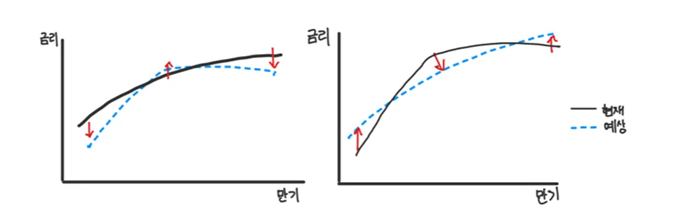 오늘은 채권의 '적극적' 운용 전략을 알아보겠습니다. 투자에서 '적극적' 혹은 '액티브'라는 표현을 사용하는 경우, 전략적인 거래를 통해 시장 수준 대비 초과 수익을 추구한다는 것을 의미합니다. 1. 수익률 곡선 타기 전략 일반적으로 수익률은 단기에서 장기로 갈 수록 높아진다는 것을 기억하시나요? 따라서 수익률 곡선은 보통 다음과 같이 우상향 형태로 그려집니다. 이 경우, 장기채를 매입해서 보유한다면 시간이 지남에 따라 잔존 만기가 단기 구간으로 이동합니다. 장기→단기로 금리가 하락하면서 채권 가치가 상승하며, 이 효과를 '롤링효과'라고 부릅니다. 이처럼 시간의 흐름을 이용하여 차익을 취하는 전략이 수익률 곡선타기 전략입니다. 숄더 효과 단기, ,중기채에서 채권이 만기에 가까우면, 채권 가격이 금리 변동에 더욱 민감해집니다. 작은 금리 하락 → 큰 가격 상승 이를 활용해 단기채를 매입하여 금리 하락시 더 큰 수익을 얻습니다.
