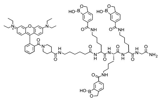 SLY is an oxaborole-functionalized fluorescent probe that targets sialyl Lewis antigens (sLeᵃ/sLeˣ) by binding terminal sialic acid on cancer cell surfaces, enabling selective fluorescence labeling. After binding, SLY is internalized via caveolae-mediated endocytosis and accumulates in mitochondria; this selectivity is supported by decreased signals upon sialidase treatment and inhibited uptake with Filipin. SLY provides high-contrast imaging in cancer cells (e.g., HepG2 and HT29) and tumor tissues versus normal counterparts, highlighting its potential for high-fidelity cancer tissue imaging and fluorescence-guided surgical applications.