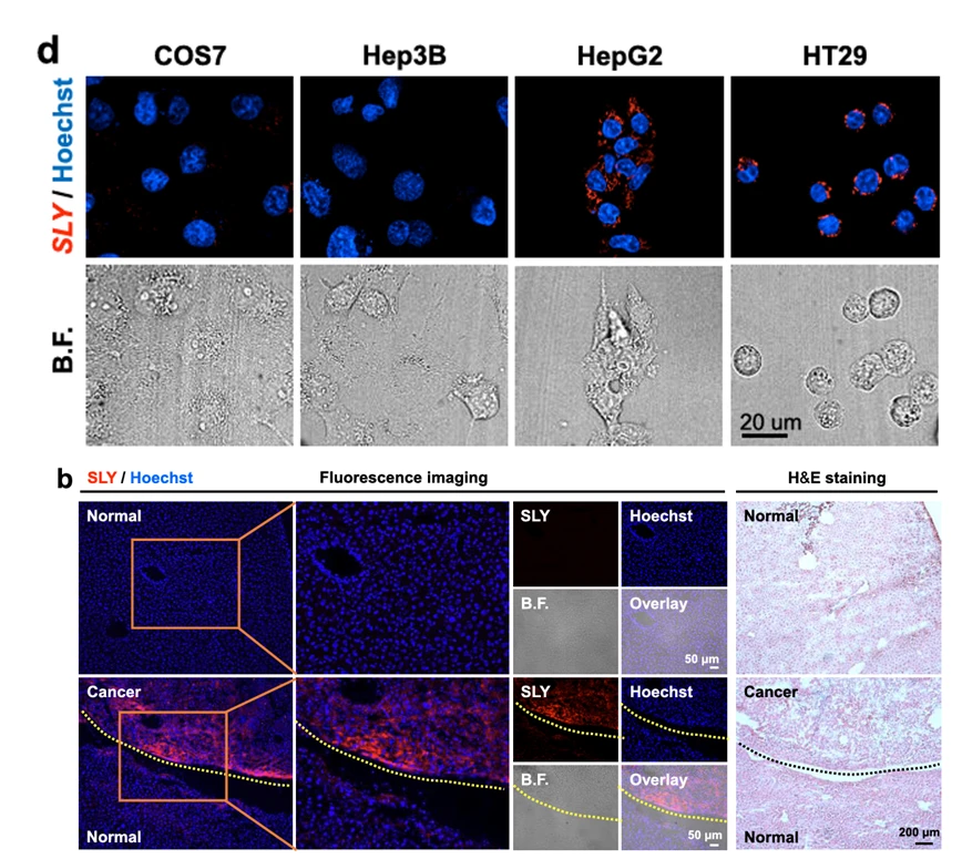 (d)Fluorescence imaging of celllines using SLY. COS7, Hep3B, HepG2, and HT29 cells were incubated with SLY(50nM) for 1h prior to imaging.