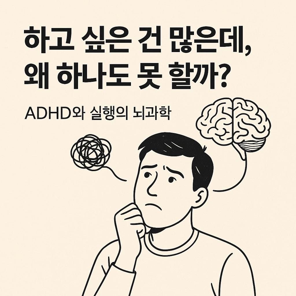 “나는 하고 싶었다. 그런데 왜 하지 못했을까?” 그 질문 앞에서 너무도 많은 ADHD인들이 스스로를 책망한다. 하지만 이 물음은, 잘못된 주어로 시작된 질문이다. 당신이 한 게 아니다. 당신의 뇌가 한 것이다. ‘의지’라는 신화 우리는 흔히 실행을 ‘의지의 문제’로 여긴다. 할 일을 미룬다 = 게으르다. 끝까지 못 간다 = 무책임하다. 그러나 ADHD로 살아가는 이들에겐 이것이 전혀 사실이 아니다. 그들은 게으르지 않다. 오히려 머릿속은 언제나 하고 싶은 일들로 가득하다. 문제는 딱 하나다. 생각과 행동 사이의 다리가 없다. 실행을 설계하는 뇌, ‘집행기능(Executive Function)’ 인간의 뇌에는, 생각을 실제 행동으로 전환하는 통제탑이 있다. 우리는 그것을 ‘집행기능’이라 부른다. 이 기능은 전두엽(Prefrontal Cortex)과 그 연결망에서 비롯된다. 결정을 내리고, 계획을 세우고, 감정을 통제하며, 방해를 무시하고, 몸을 움직인다. 말하자면, 이 부위는 ‘의지’라는 이름을 대신 살아가는 물리적 신경 구조다.