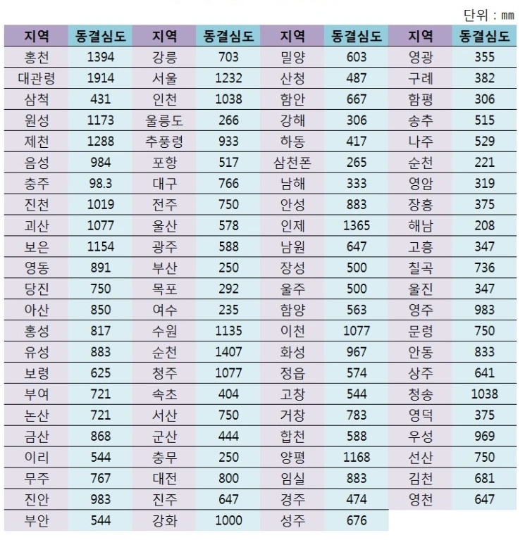- 도시 vs 해안 차이 : 도시화·난방 영향 등으로 동결 심도가 상대적으로 낮음