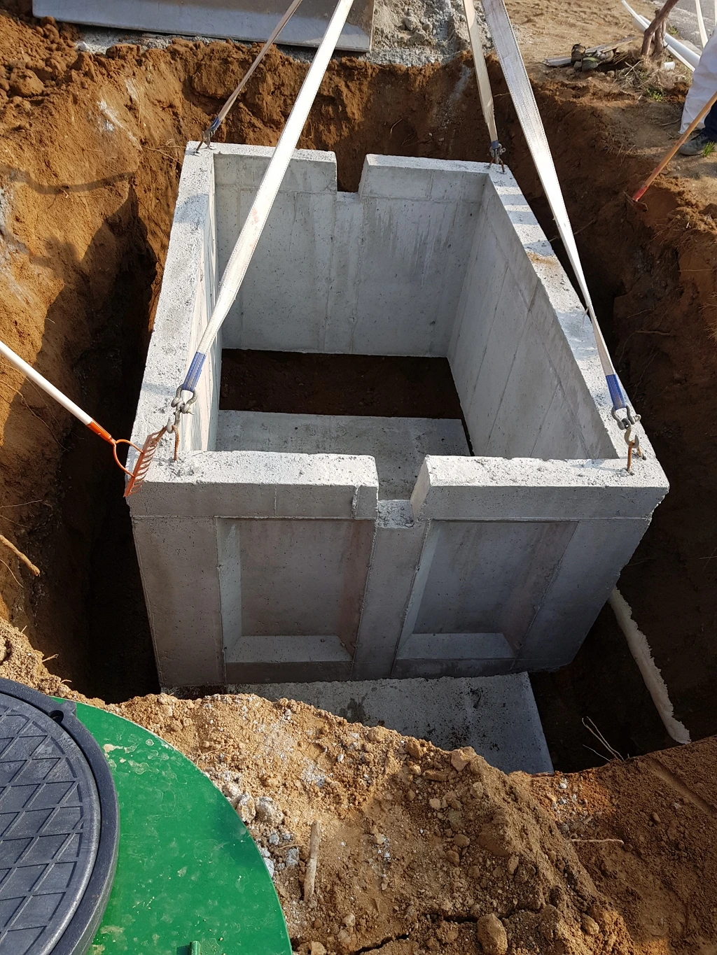 크레인 또는 굴삭기로 정화조 탱크를 설치