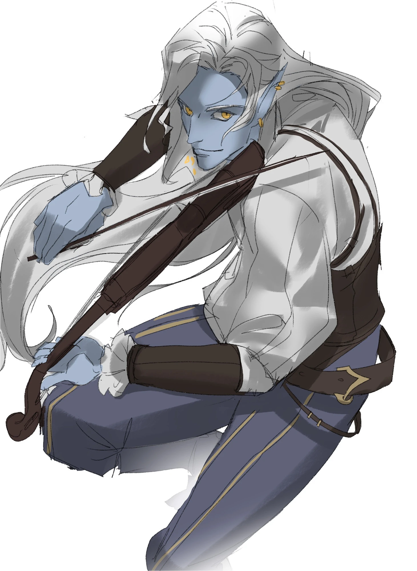 이름: 자리스토 종족: 드로우 배경: 연예인 클래스: 바드(전승학파) 성향: 혼돈 중립 힘 8 (-1) 민첩 15 (+2) 건강 13 (+1) 지능 12 (+1) 지혜 10 (+0) 매력 17 (+3) 과거 자리스토는 할로스의 오페라 홀에서 귀족들을 위해 공연하던 비올 연주자였습니다. 빈민가에서 곤궁하게 지내던 시절도 있었지만 음악적 재능 덕분에 리솔 가문 귀족의 눈에 들어 후원을 받기 시작한 이후부터는 남자 드로우 기준 아쉬울 것 없는 생활을 누릴 수 있었습니다. 하지만 할로스의 귀족들이 모이는 장소에는 으레 음모와 첩보 활동이 포함되는 법. 비올 연주자였을 뿐인 자리스토 또한 자신의 의지와 상관없이 후원자의 첩보원이 되어 밀서를 전달하는 등의 지령을 수행하게 되었습니다. 그렇게 자신의 신변이 점점 위험해짐을 느끼던 어느 날 자리스토는 암살자의 습격을 받게 되고, 절체절명의 순간에 음악 자체가 자신의 무기임을 발견하여 살아남는데 성공합니다. 귀족의 꼭두각시 처지에서 벗어나 오래전부터 꿈꾸던 자유로운 삶을 추구하기 위해, 자리스토는 도시를 탈출하고 지상 여행을 시작하게 됩니다. 성격 특성 신사적인 태도, 자기애, 낙천적, 혼돈 추구. 신사적인 태도: 귀족들을 상대하던 탓에 품위 있는 태도가 몸에 붙음. 별로 신사적이지 않은 상황에도 이러한 태도를 꾸며냄. 자기애: 자신의 연주와 외모에 자부심을 가지고 있음. 이를 어필하는 데도 진심. 낙천적: 모든 상황은 종래에 나아질 수 있다고 믿음. 상황을 쉽게 받아들이고 긍정적인 면을 찾아냄. '어떤 상황에서도'. (ex: 우리의 물자들이 물에 떠내려갔지만 어딘가의 물고기들은 주린 배를 채웠겠군요. 그렇지요?) 혼돈 추구: 물질적, 정신적 가치 위에 '본인 흥미' 있음. 질서 무너뜨리기, 장난 치기, 억압자에 대항하기 등 혼란을 일으키는 일에 흥미를 느끼고 이러한 일에는 아무리 위험하더라도 뛰어듬. 행동이 제한되는 상황은 선호하지 않음. 결점 대책 없음, 책임 회피 성향. 대책 없음: 상황이 흘러가는 대로 놔두는 성향 때문에 계획을 세우지 않고 일을 저지르고 봄. 책임 회피 성향: 자유로운 성향이라는 것은 곧 회피 성향이 강하다는 뜻. 진지하지 못하고 확실한 책임을 지는 것에 약함. (ex: 책임에 대한 확답이 필요한 순간에는 말을 흐리다가 능청스럽게 주제를 돌리거나 다른 사람에게 맡김.) 특징 드로우 남자: 여자 드로우나 나라네우스의 사제는 깍듯이 대우하지만 자신의 안위나 신념보다 중요하게 생각하지는 않음. 바드: 음악에 관해선 우열을 따지지 않고 모든 장르를 동등하게 좋아하고 존중함. 나라네우스와 매트론, 거미를 주제로 하는 곡이 주 특기. 목표 자신의 신변에 대한 완전한 자유. 남을 돕는 이유 자신의 자유를 보장해줄 수 있는 물질적 보상 또는 개인적인 흥미 때문에. ▲초기 디자인 ▲커미션 by 토마토옙스키님 ▲by 헤덕님