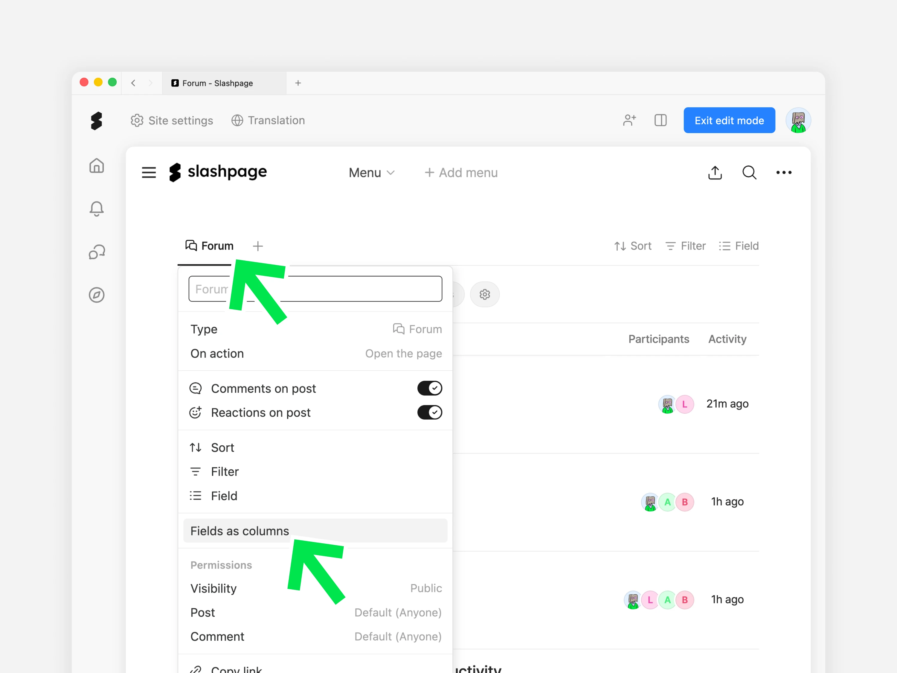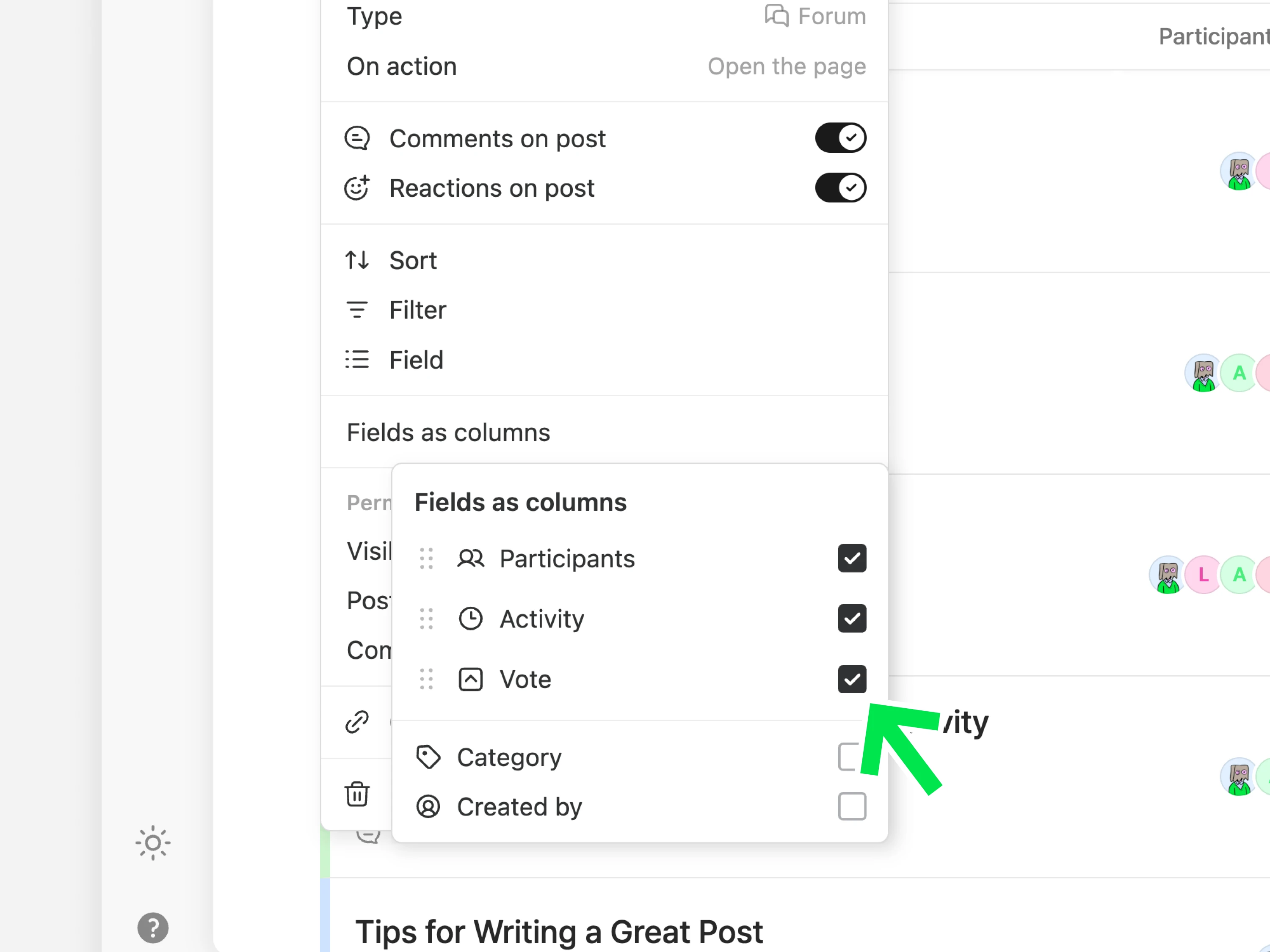 포럼 채널의 글 목록에는 제목 옆에 참여자와 최근활동 항목이 기본으로 표시됩니다. 표시되는 항목 종류를 변경하려면 멀티뷰 탭에서